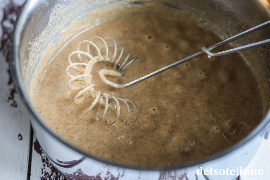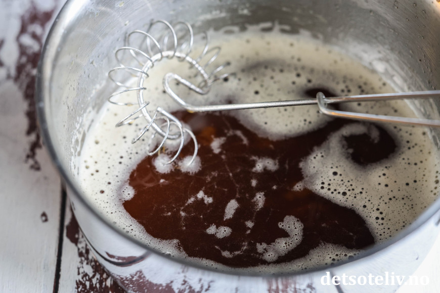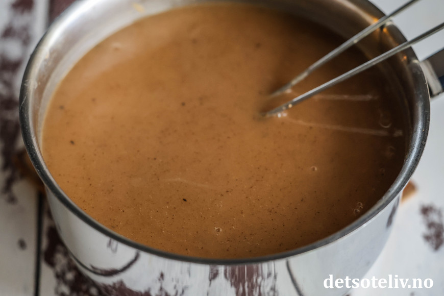 Fortsett bruningen over middels varme mens du visper hele tiden, til jevningen har fått mørkebrun farge.