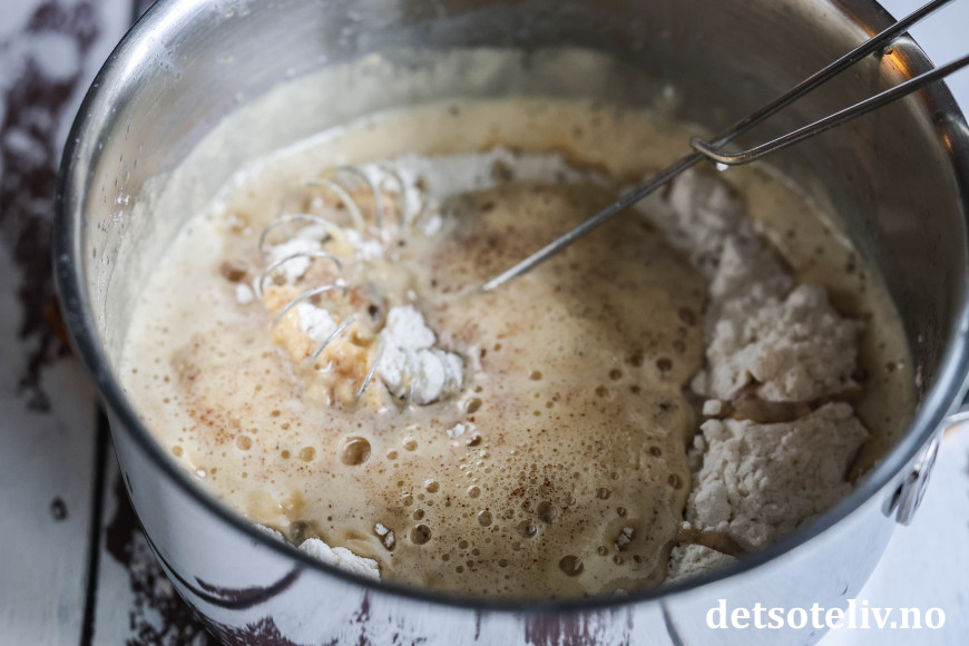 Når smøret har fått ønsket brunfarge, tilsettes hvetemelet.