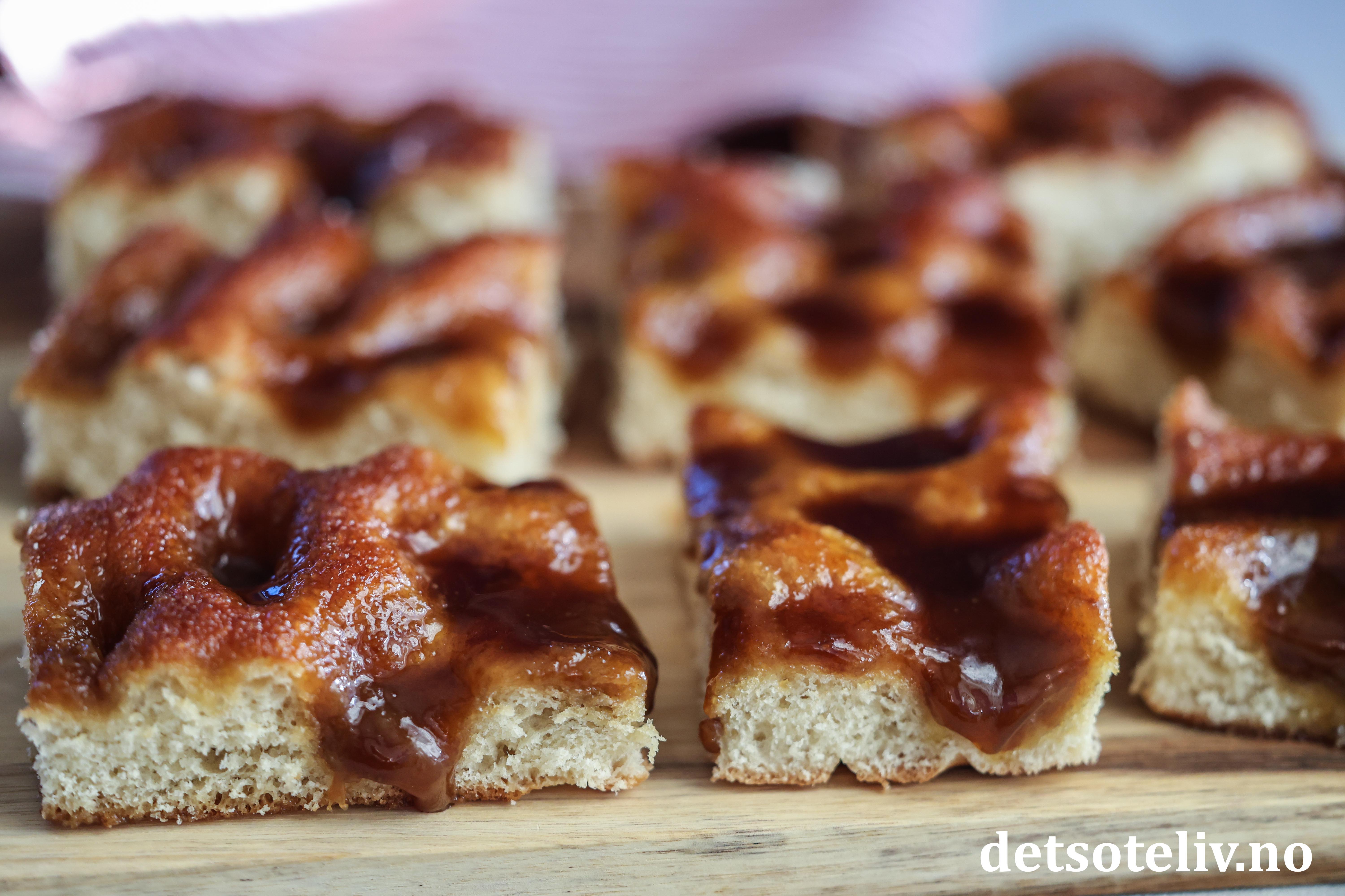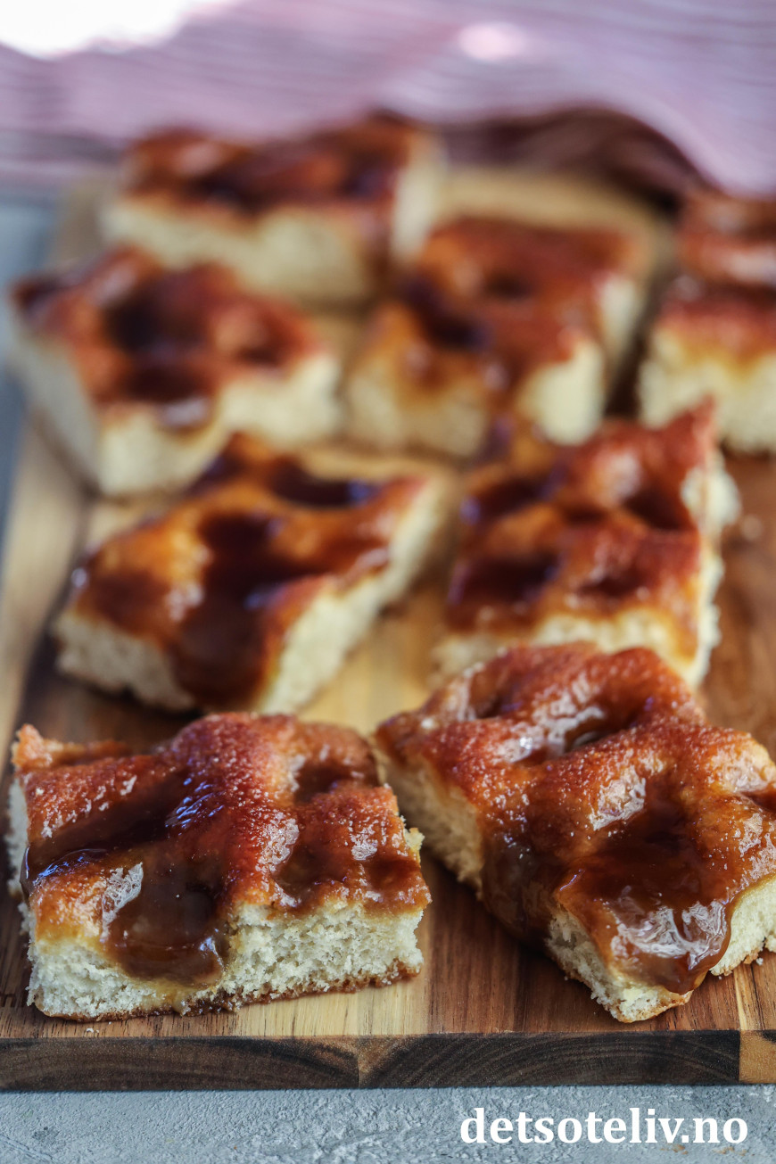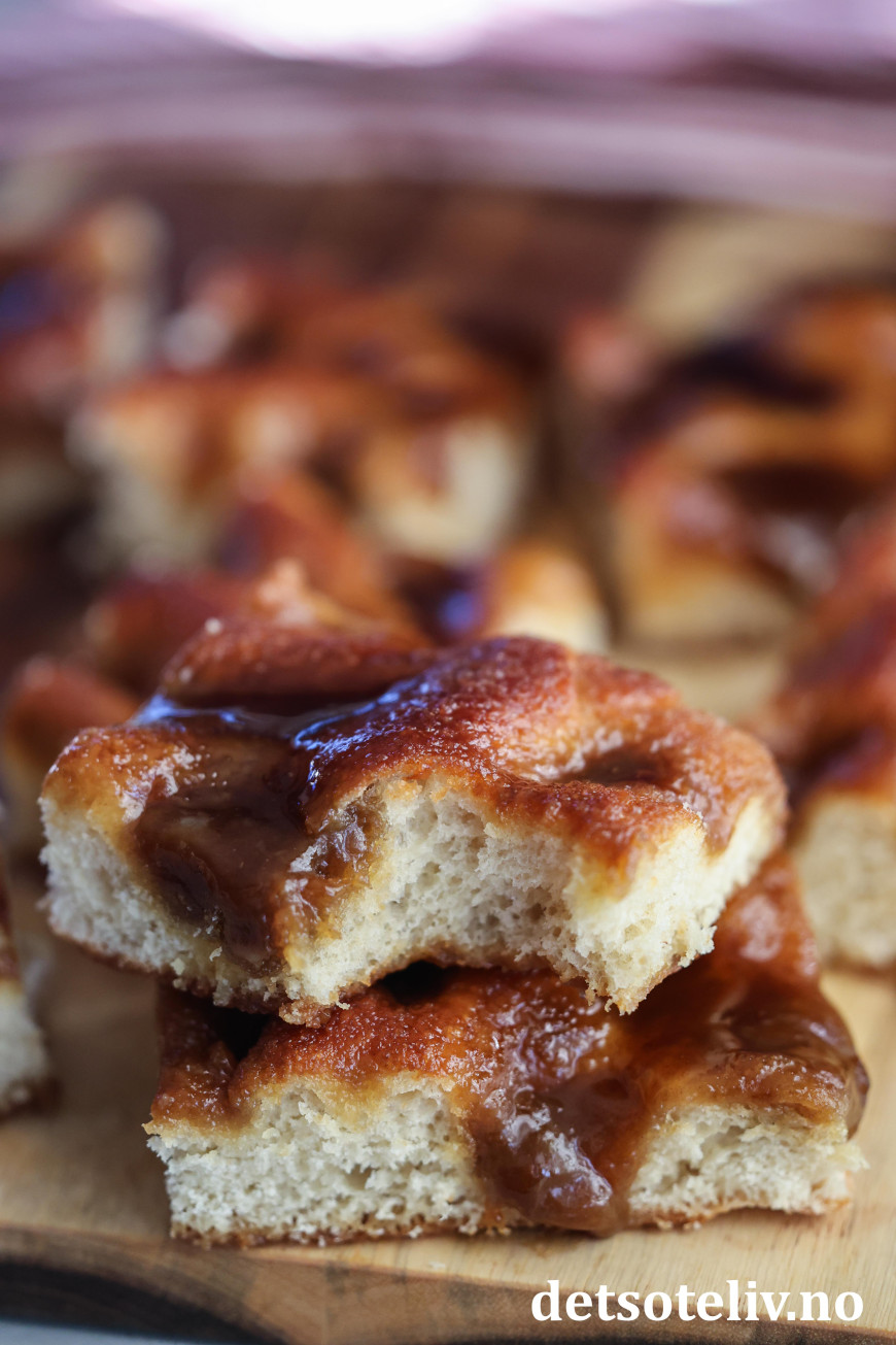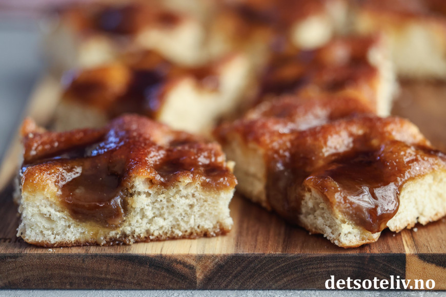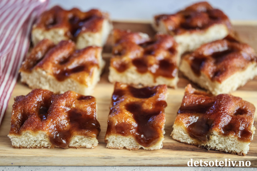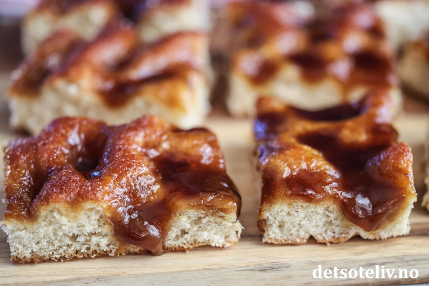 Den ferdigstekte kaken skjæres i firkanter og blir klissete, fet og deilig.