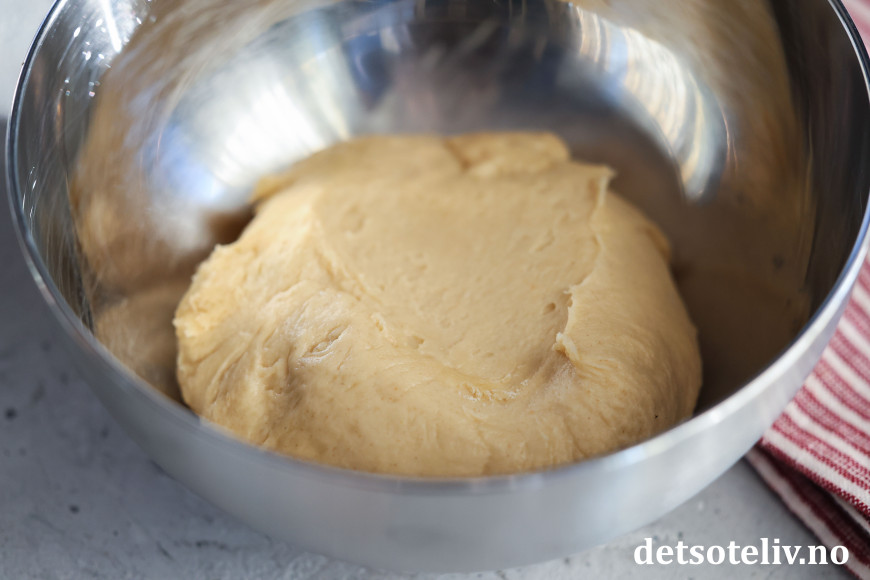 Smelt smøret i en liten kjele. Tilsett melken og la blandingen bli fingervarm. Løs opp gjæren i væsken. Tilsett sukker og lett sammenpisket egg. Elt deretter inn hvetemelet til en liten, smidig deig.