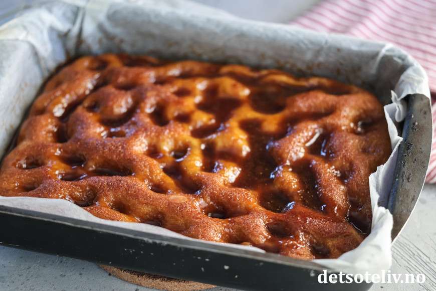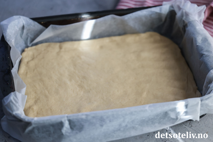 Dekk en liten langpanne (ca. 20 x 30 cm) med bakepapir. Ha deigen i formen og klem den utover i formen til en flat og jevn kake.