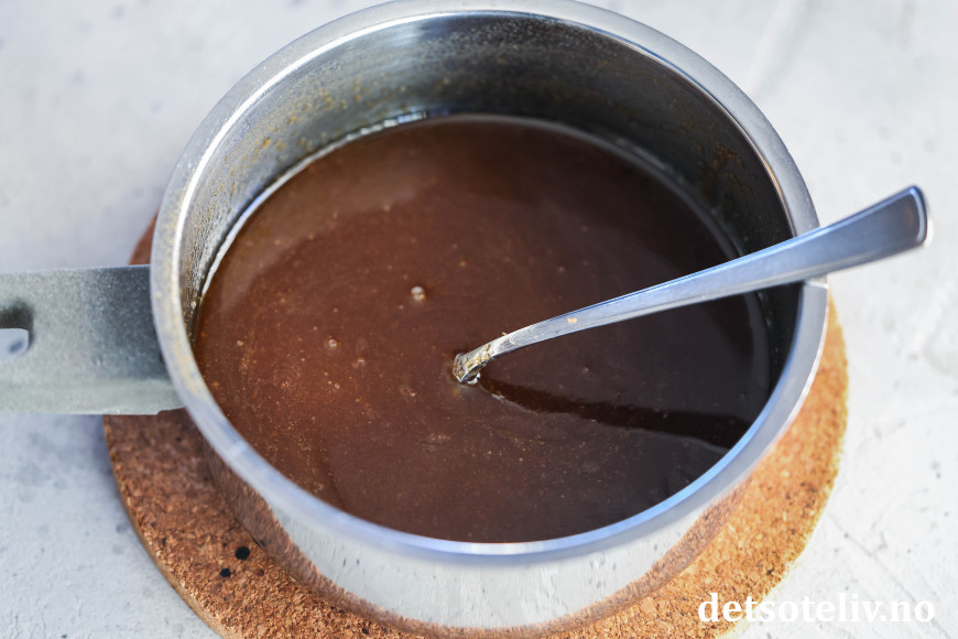 Varm opp på middels varme til smøret har smeltet (blandingen skal ikke koke). Rør blandingen jevn og la stå i romtemperatur til deigen har etterhevet ferdig.