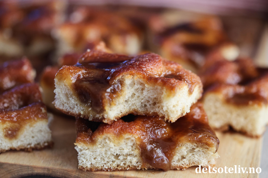 ♥ Kanelfyllet kommer til å være nokså flytende når kaken tas ut av ovnen, men det stivner til ved avkjøling. Kaken er best når den er avkjølt i romtemperatur så lenge at fyllet slutter å være rennende, men likevel er bløtt nok til at det er klissete.