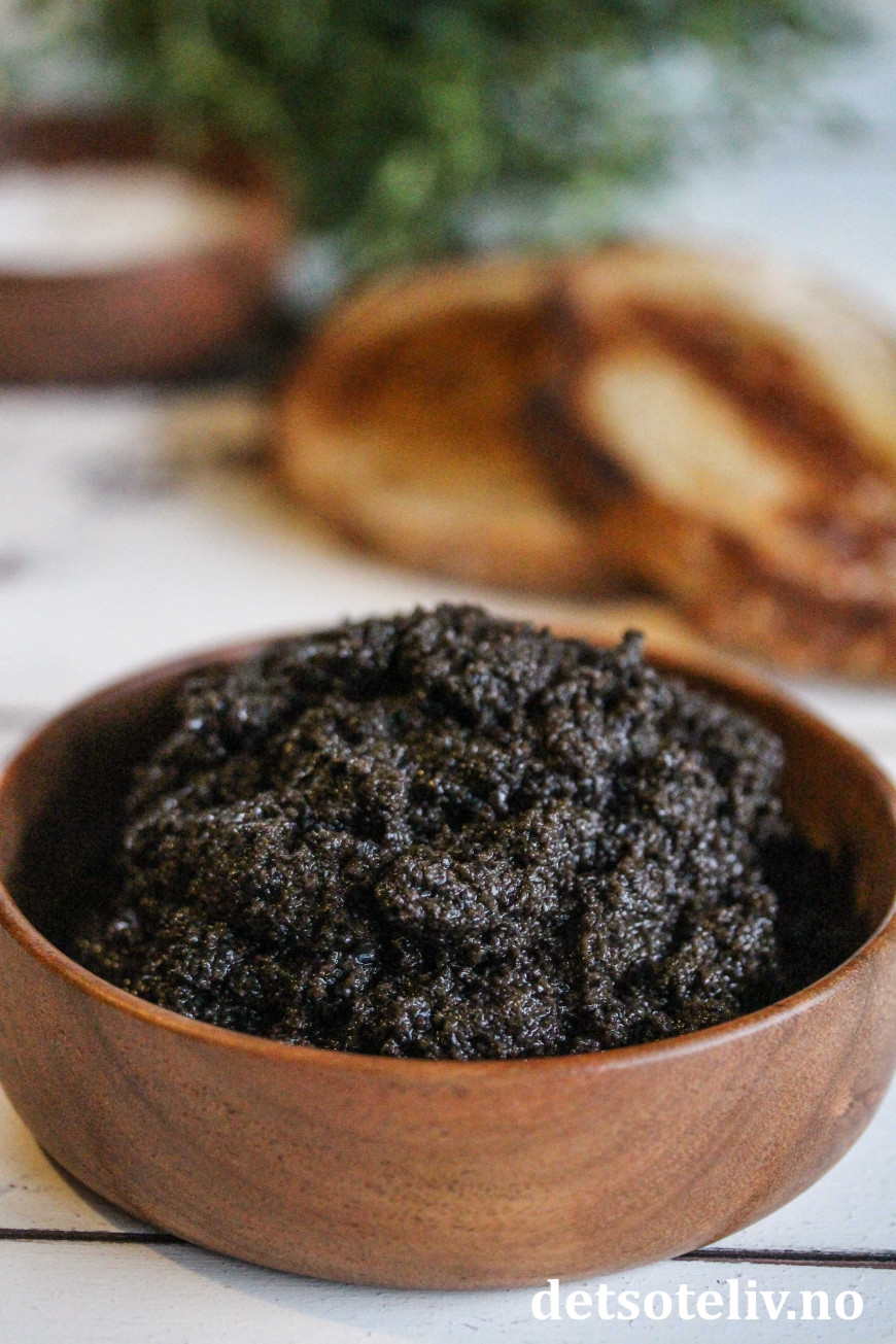 ♥ Mengdeangivelsen her er bare veiledende, selv om oppskriften i utgangspunktet sier 6 ganger mer oliven enn olje. Hvor stor porsjon du vil lage og hvor mye olje du liker er en smakssak. Du kan lage en mindre porsjon, og du kan bruke mindre olje hvis du foretrekker det. Bare spe på med så mye olivenolje i olivenmosen til du synes at konsistensen blir passe.