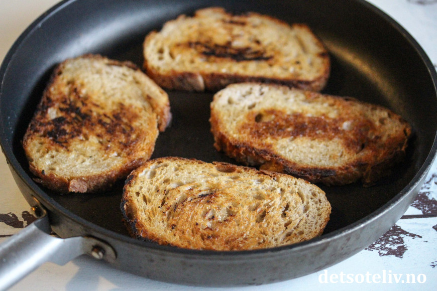 Stek skiver av brød i stekepanne på begge sider. Bruk olivenolje i pannen slik at brødskivene blir skikkelig sprø.