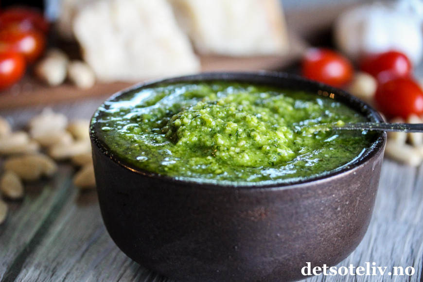 Start med å gjøre klar pestoen. Den kan oppbevares i kjøleskapet i flere dager: