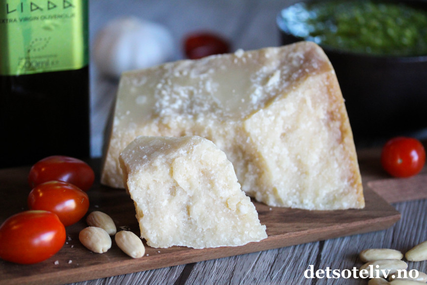 ♥ Jeg bruker parmesanen Parmigiano Reggiano både i pestoen og på toppen av bruschettaene.