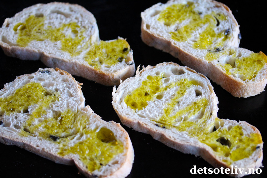 Legg brødskivene på en stekeplate og drypp over god olivenolje.