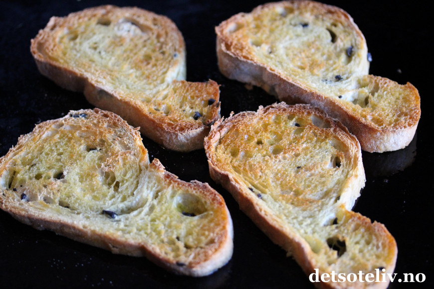 Bruk 4 skiver godt brød. Jeg bruker dette fantastisk gode olivenbrødet, men annet brød kan også brukes.