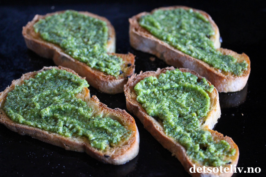 Ta brødskivene ut av ovnen og smør på et godt lag pesto.