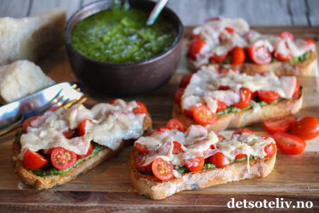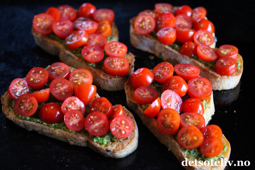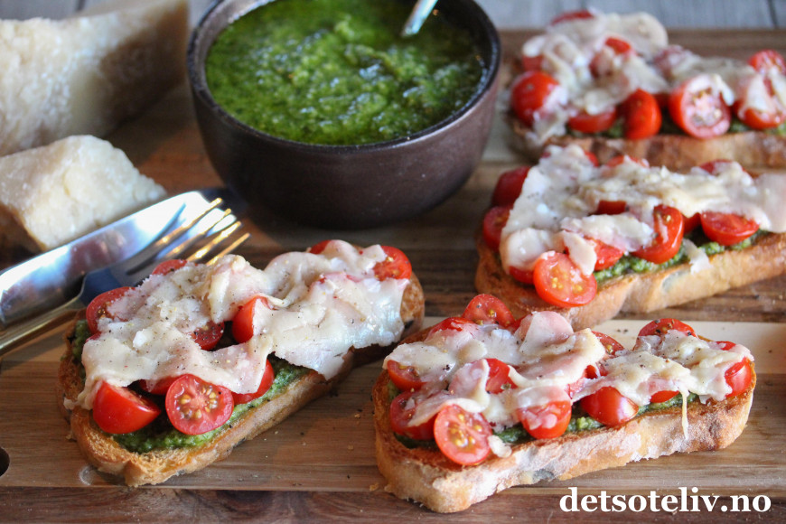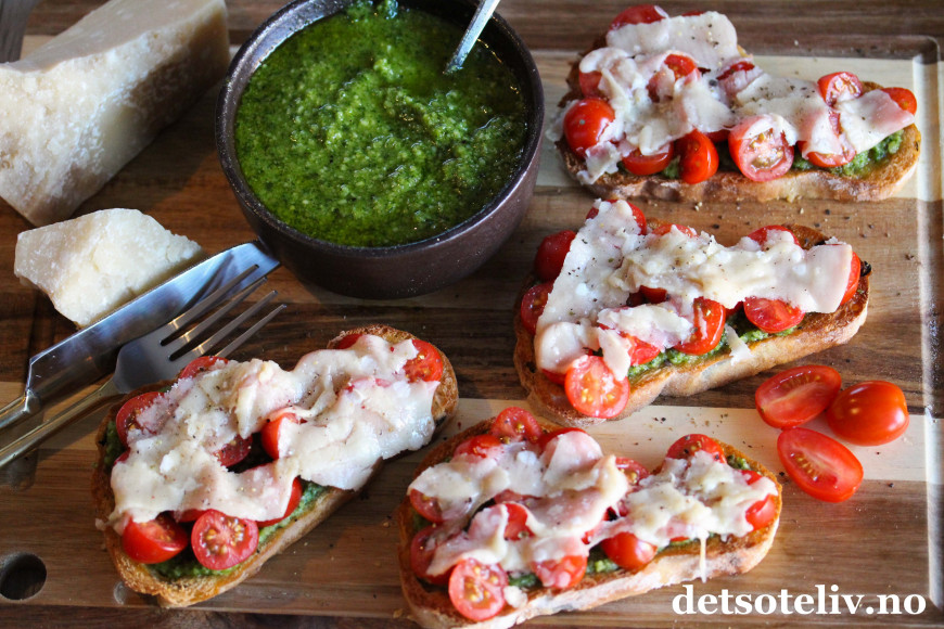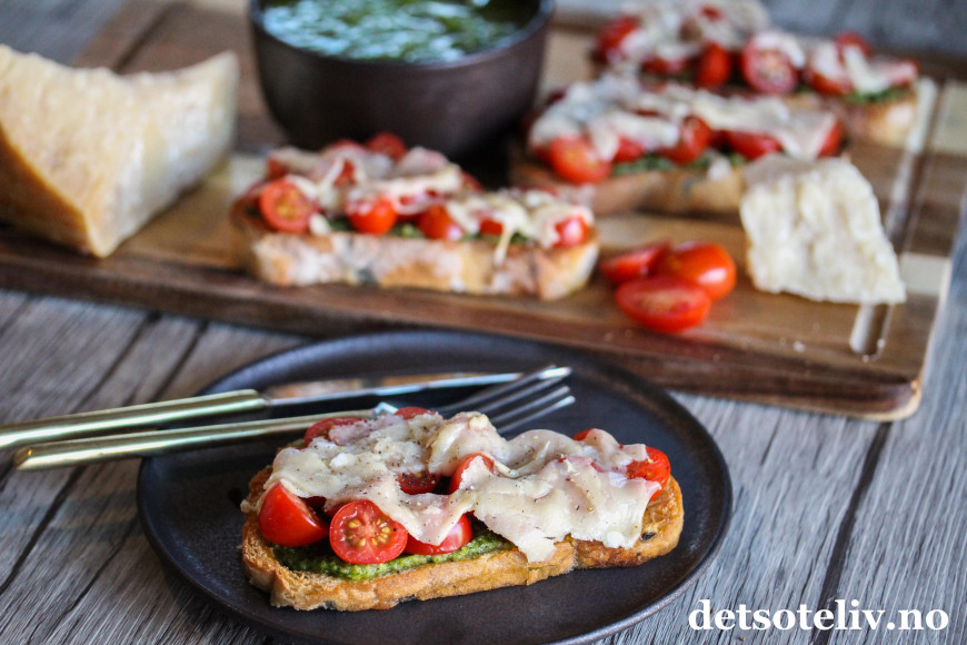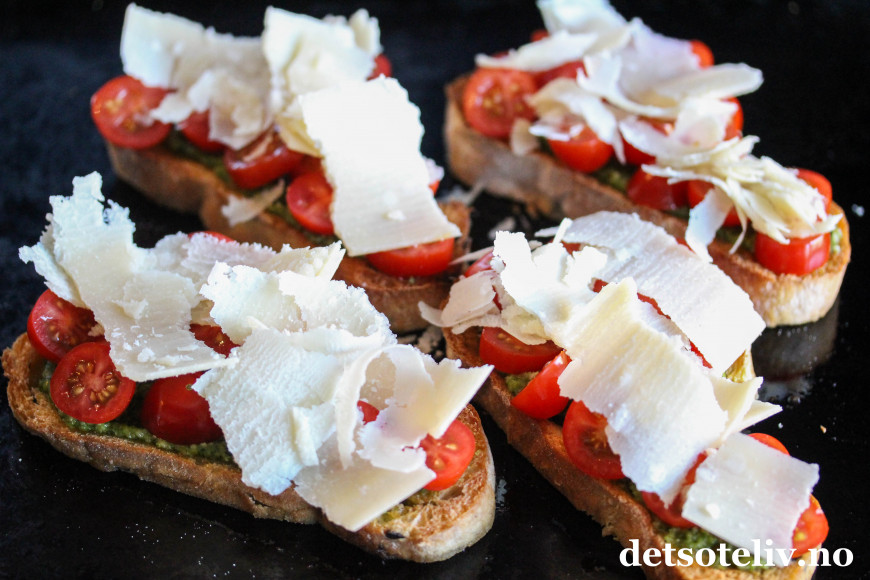 Denne varianten av bruschetta har jeg laget med hjemmelaget pesto (Pesto trapanese), masse søte cherrytomater og ekte, italiensk parmesan; en 30-månederlagret Parmigiano Reggiano!