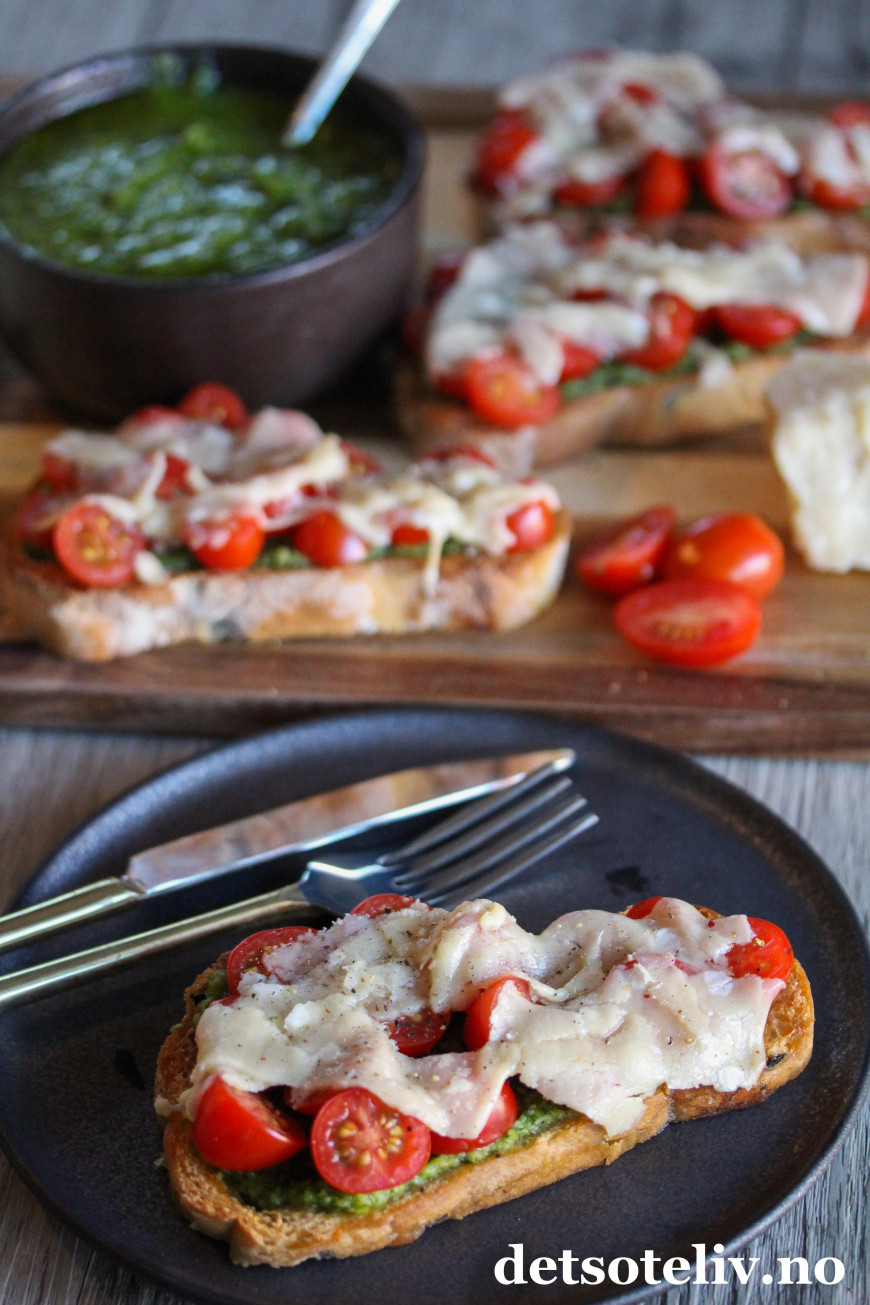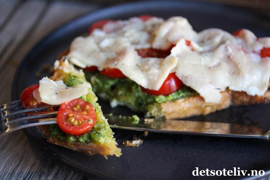 ♥ Du bruker ikke hele porsjonen med pesto til de 4 brødskivene, men som sagt kan hjemmelaget pesto oppbevares i kjøleskapet i mange dager. Dekk til med plast for å hindre at hvitløkslukten sprer seg på andre matvarer.
