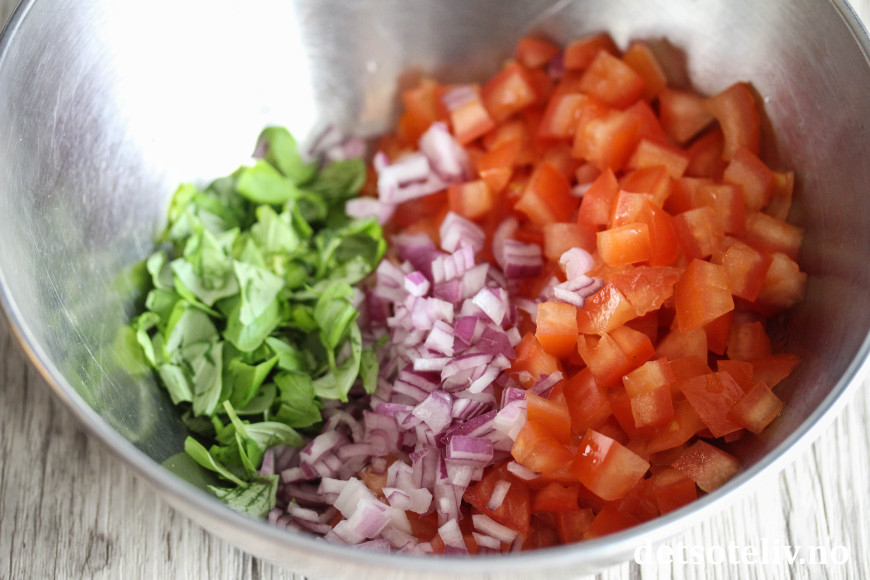 Kutt tomatene opp i små terninger. Finhakk rødløk og basilikumblader.