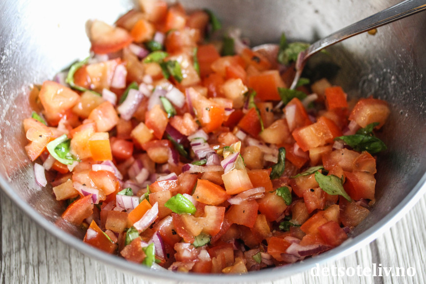 Forbered tomattoppingen. Skjær tomatene i båter og fjern innmaten. Kutt tomatene opp i små terninger. Finhakk rødløk og basilikumblader.