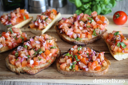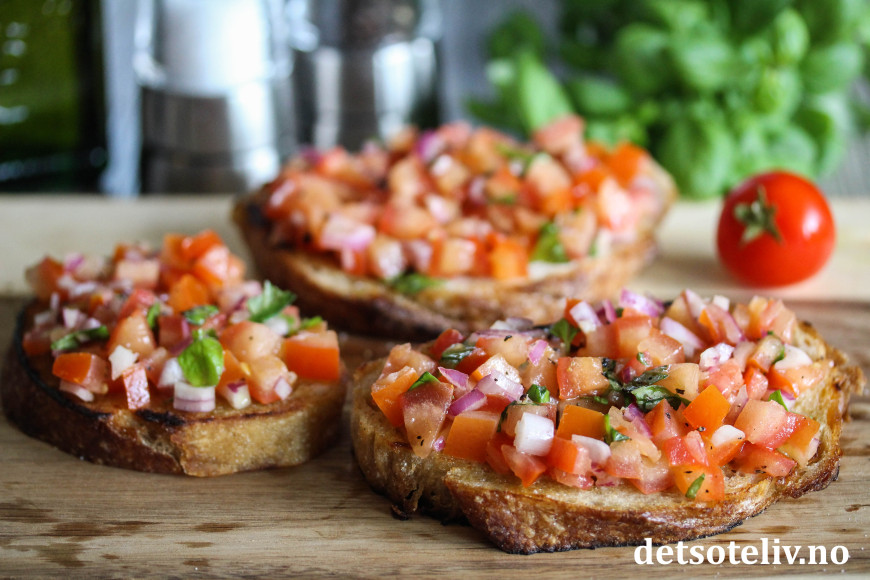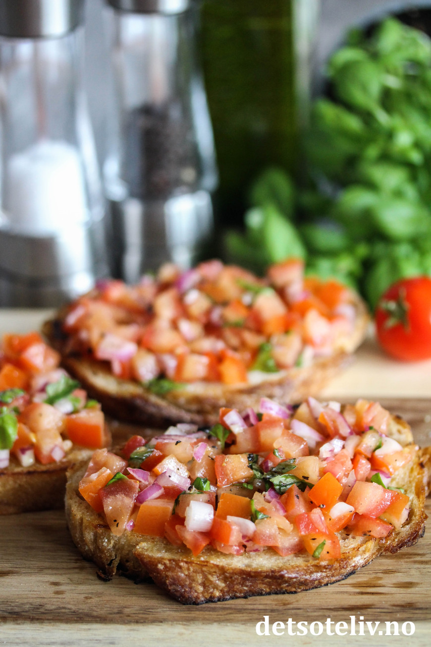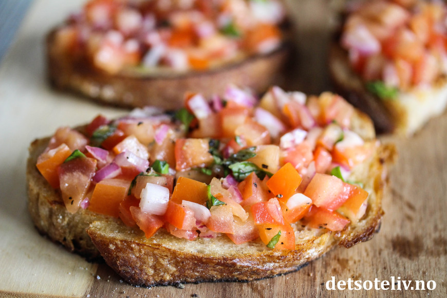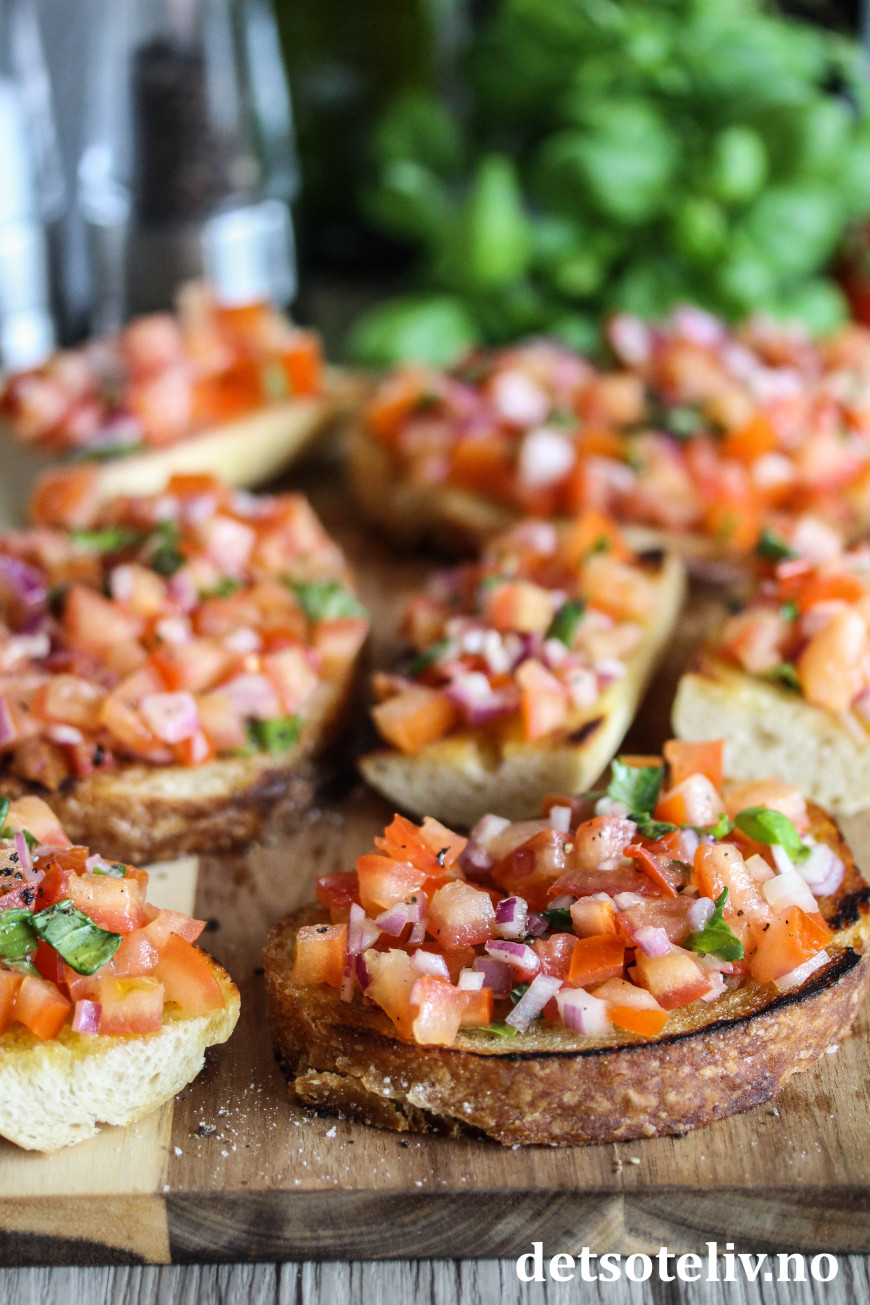 Bruschetta er skikkelig herlig å servere på sommeren!