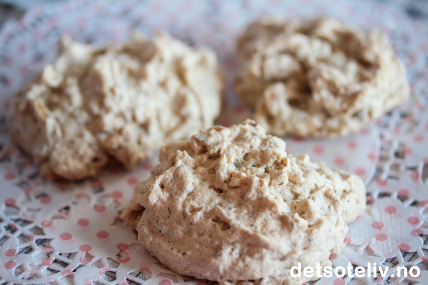 ♥ Det er viktig å ikke røre masse i marengsen etter at den er pisket stiv. Nøtteblandingen skal bare vendes i forsiktig. Dette fordi marengsen kan bli for tynn i konsistensen hvis det røres i den for mye, og da får du helt flate kaker.