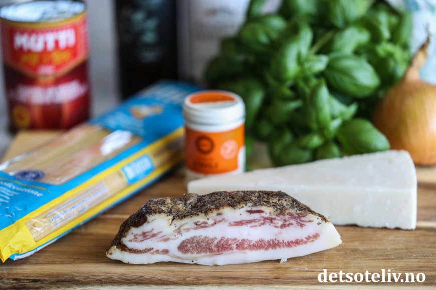 Amatriciana skal helst lages med guanciale, som er italiensk, speket svinekjake med mye fett, som smelter og gjør sausen ekstra smakfull. Alternativt kan du bruke italiensk pancetta eller vanlig bacon.
