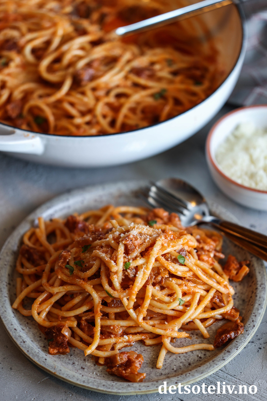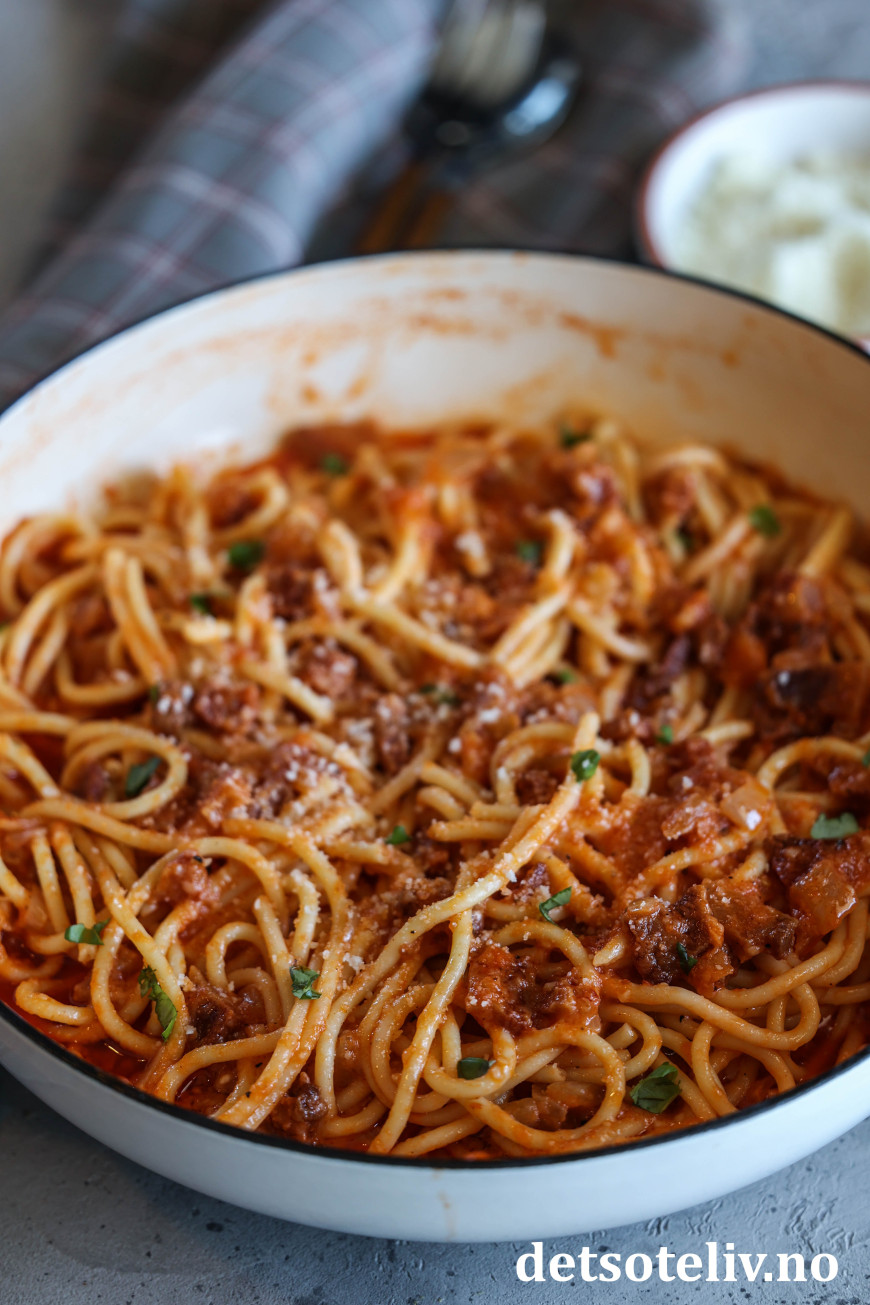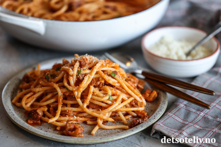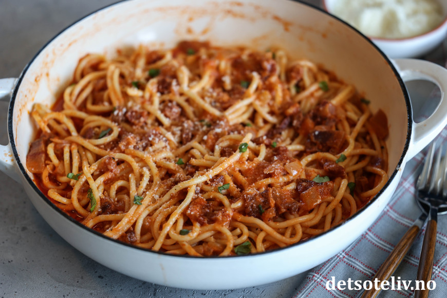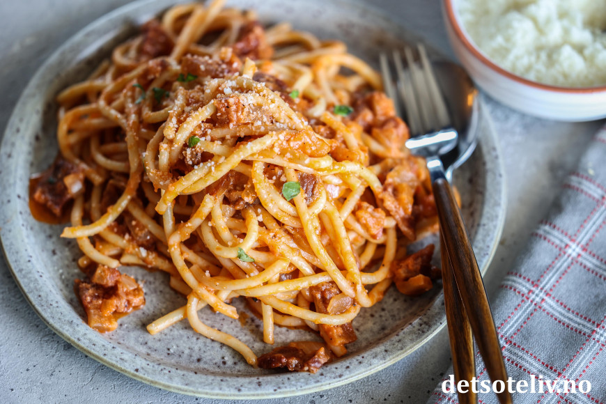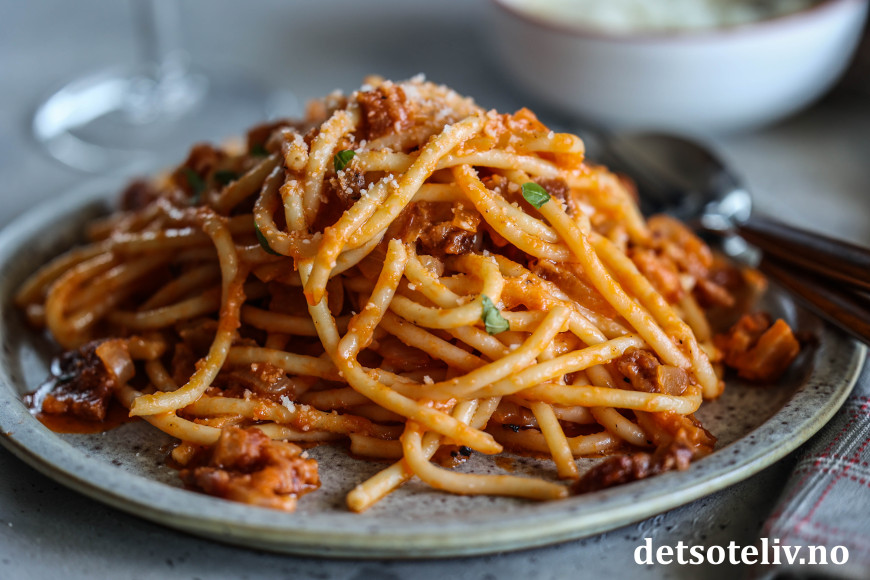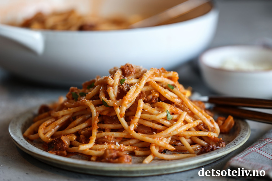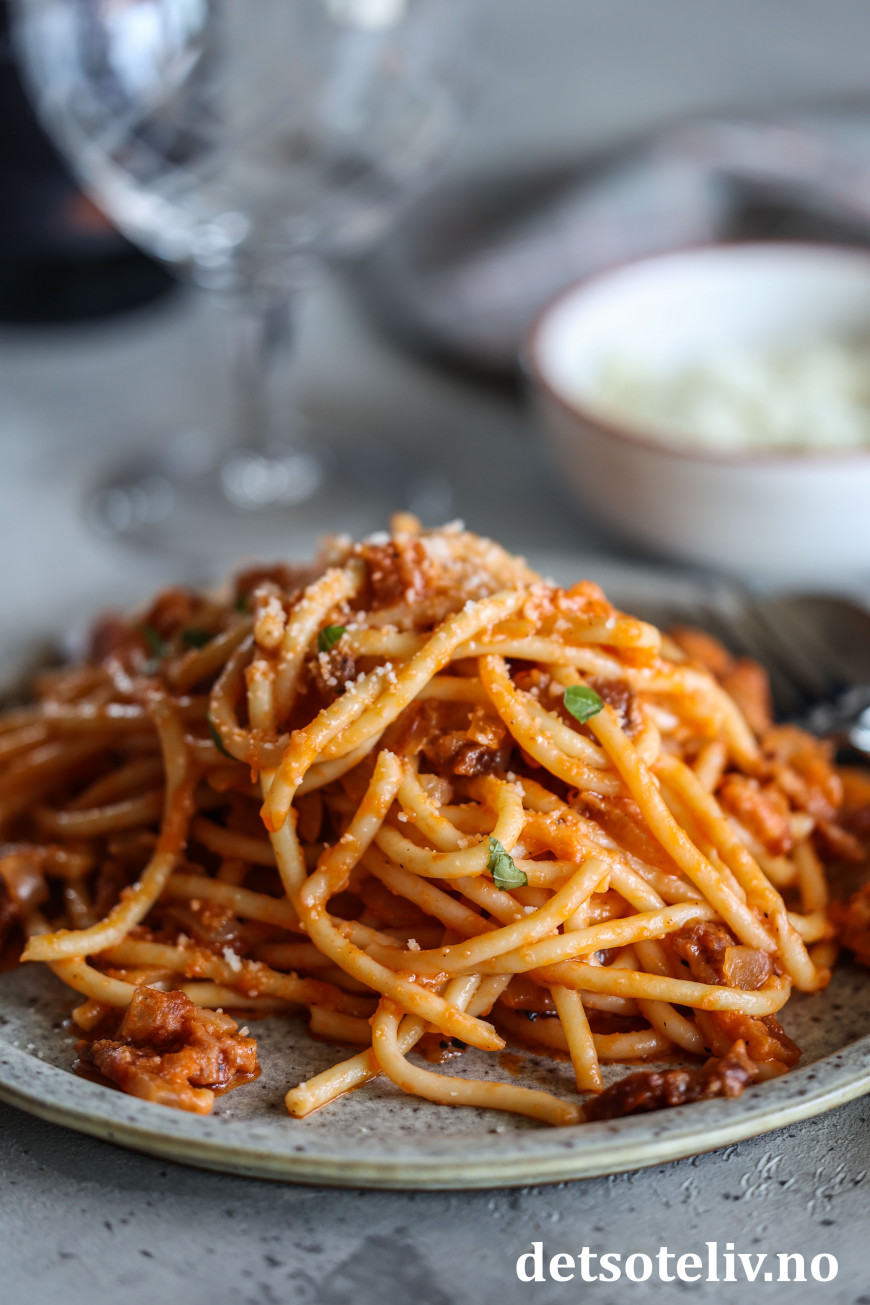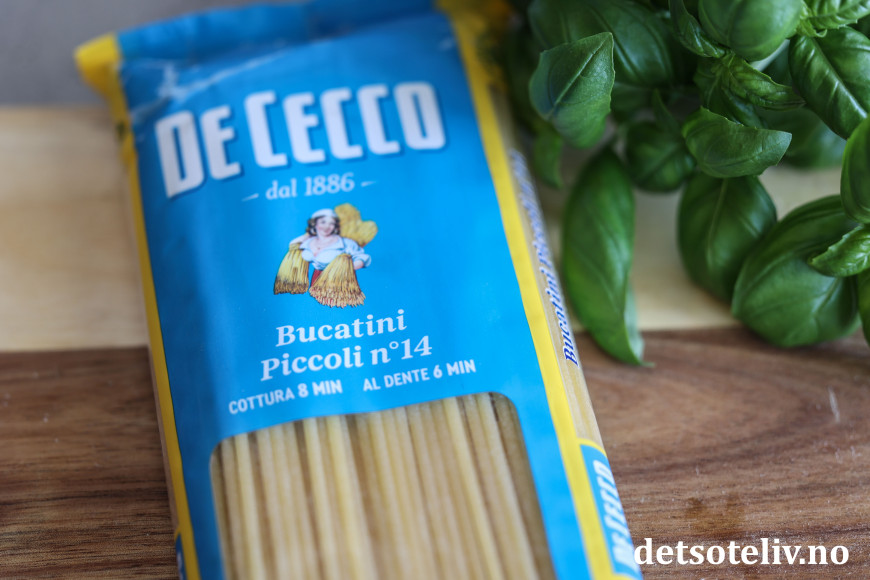 ♥ Bucatini er litt tykkere spagetti som er hule inni. Bruk vanlig spagetti hvis du ikke får tak i dette.