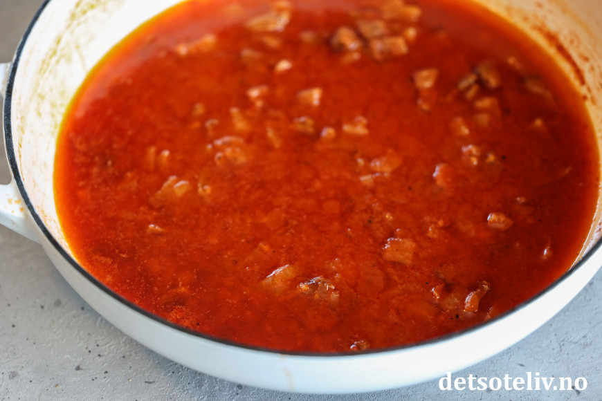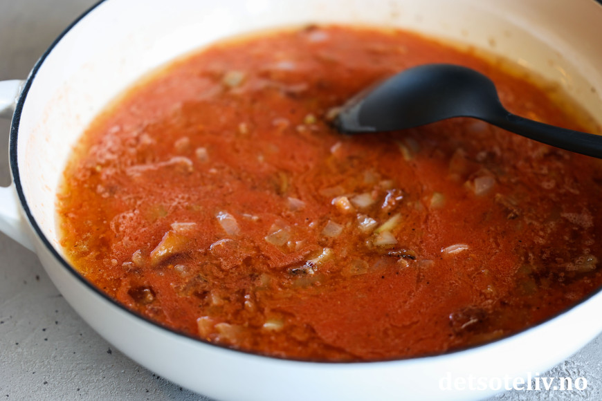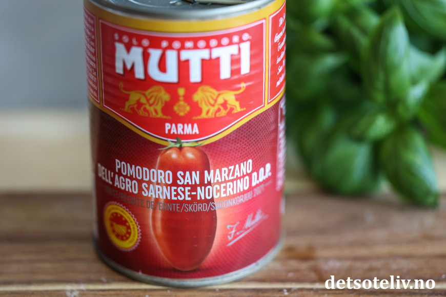 ♥ Bruk hermetiske tomater av god kvalitet. Jeg bruker gjerne San Marzano-tomater som har nydelig smak. Hvis du bruker mer ordinær type, kan det vært lurt å tilsette en liten teskje sukker i sausen siden tomatene da er litt mindre søte.