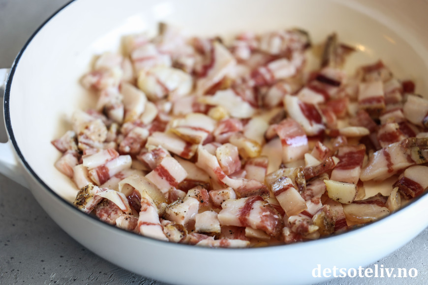 Dersom du ikke har ekte italiensk guanciale eller pancetta, går det også helt greit å bruke vanlig bacon, men bruk gjerne et stykke som du skjærer i små terninger i stedet for tynne baconskiver (selv om det selvsagt også blir bra).