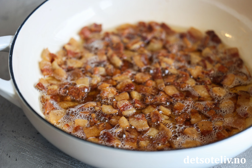 Varm opp pannen og la kjøttbitene steke på middels varme til mesteparten av fettet har smeltet og legger seg i pannen. Dette tar ca. 10 minutter. Følg nøye med så bitene ikke blir brente.