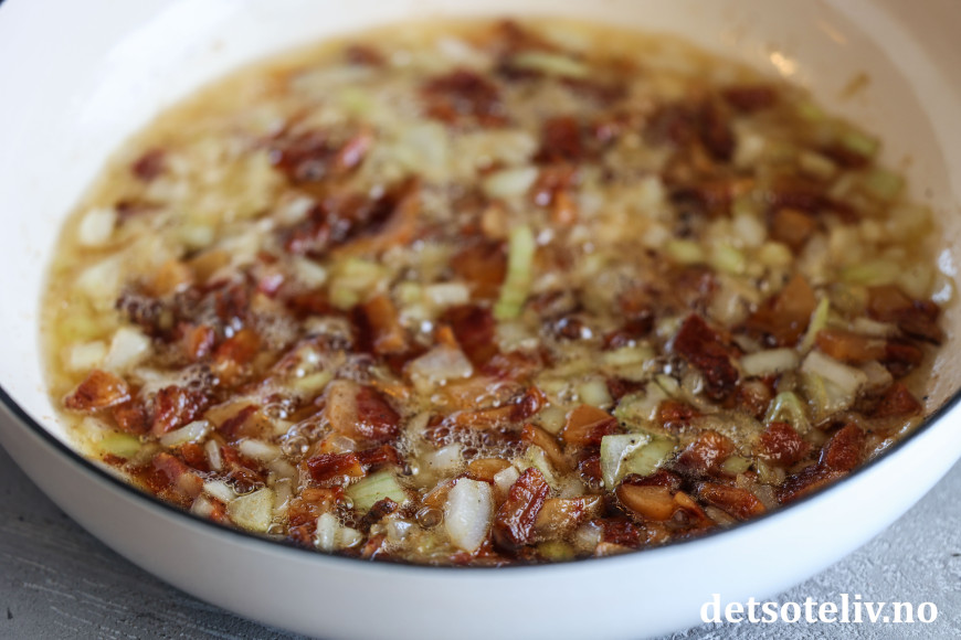 I en annen stekepanne stekes hakket løk i olivenolje på middels varme til løken blir gyllen og myk.