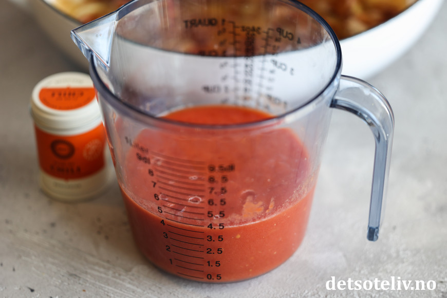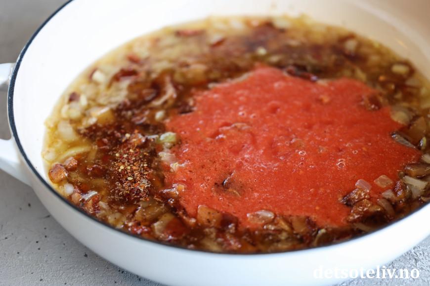Ha hermetiske tomater i en beholder og mos dem til en jevn saus med en stavmikser. Ha tomatsausen i pannen sammen med chiliflak. La dette koke sammen på lav varme i ca. 30 minutter.