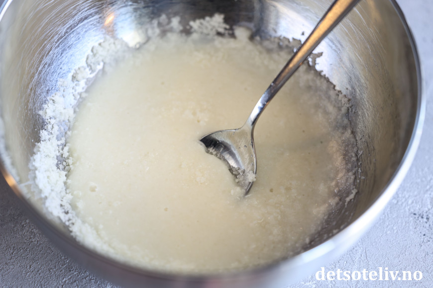 Ha omtrent 3/4 av den revne osten i en skål. Tilsett ca. 1 dl pastavann og rør dette sammen til en grøt.