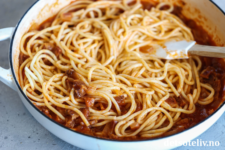 Kok i mens bucatini (eller spagetti eller annen type pasta) i saltet vann som anvist på pakken, men la det stå igjen 1 - 2 minutter av koketiden (spar på pastavannet).