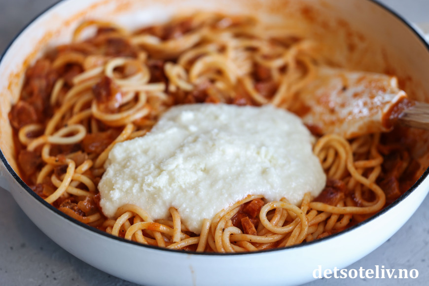 Rør rundt et par ganger og la osten smelte inn i tomatsausen. Tilpass konsistensen på sausen med ekstra pastavann.