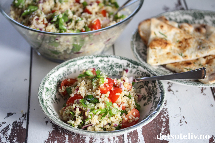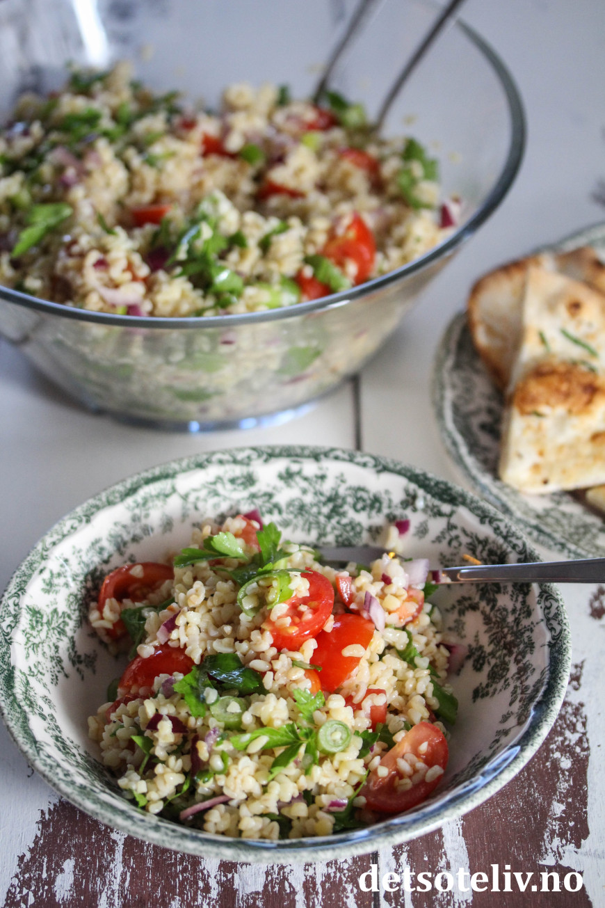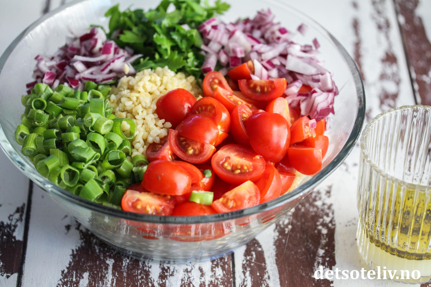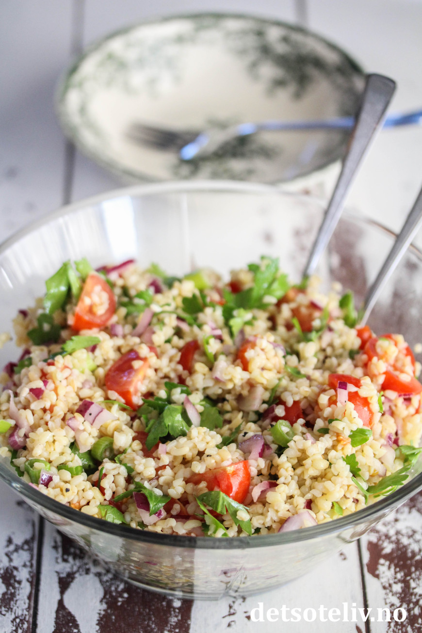 Ha gjerne plastfolie over salatbollen og la bulgursalaten stå i kjøleskapet i et par timer før servering, så smakene får trukket godt sammen.