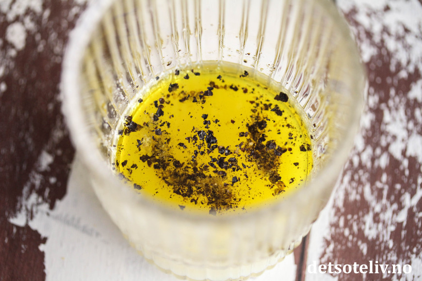 Bland sammen ingrediensene til dressingen. Hell dressingen over salaten, og bland så alt godt sammen slik at dressingen fordeler seg jevnt.