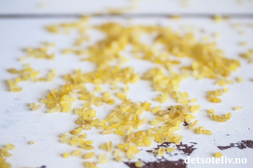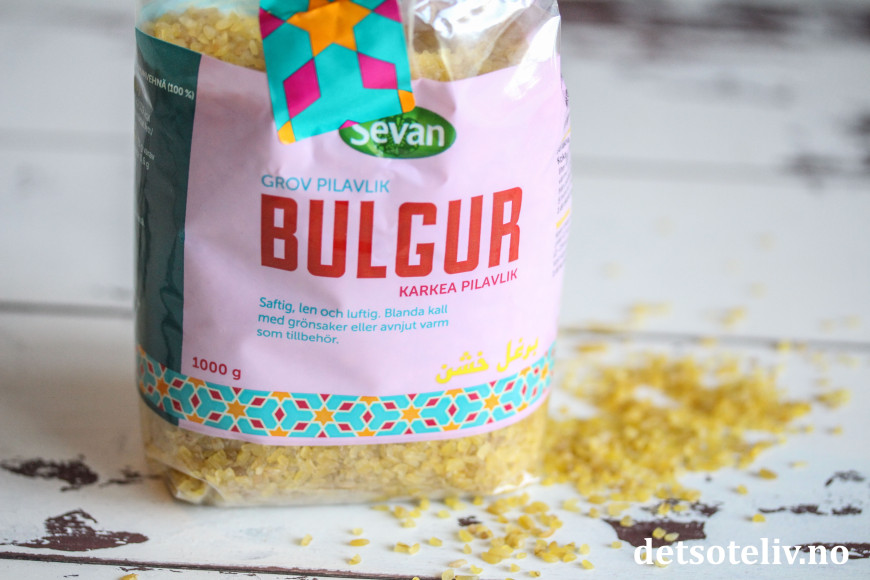 Bulgur finnes også i fullkornversjon, men det er ikke det jeg har brukt her. Jeg bruker her en mellomgrov variant. Merk at mengde vann og koketid vil variere mht type bulgur du bruker, så følg anvisningen på pakningen.