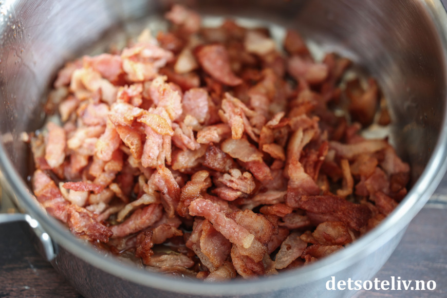 Skjær baconskivene i små biter. Ha disse i en stekepanne med litt olje. Stek baconbitene til de er gjennomstekte og ha dem deretter over i en mellomstor kjele.