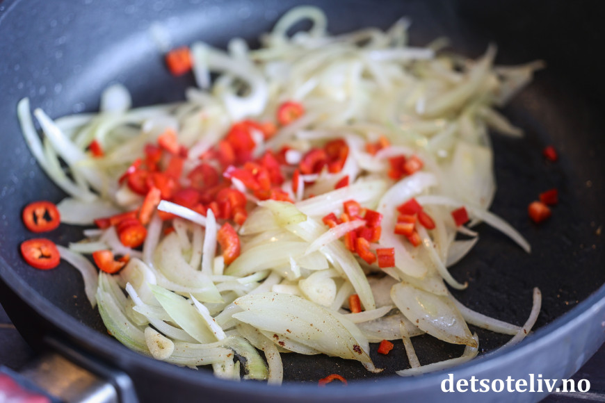 Stek løk, hvitløk og chili på middels varme i noen minutter, til løken er blank, myk og gyllen.