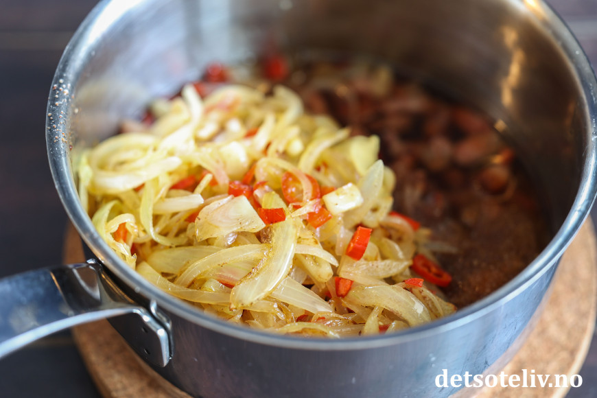 Fortsett i den samme pannen som du stekte baconet i (ikke vask stekepannen) og tilsett litt mer olje. Tilsett løk som er skjært i tynne skiver og hakket hvitløk. Kutt chili i små biter (fjern gjerne frøene inni chilien først for å unngå at marmeladen blir for sterk). Stek løk, hvitløk og chili på middels varme i noen minutter, til løken er blank, myk og gyllen.