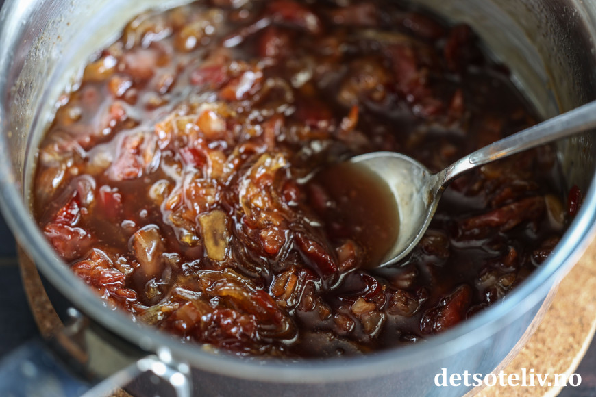 Bland alt godt sammen, og gi blandingen et oppkok. Senk varmen på platen og la blandingen småkoke uten lokk på middels varme i 10 - 15 minutter under omrøring. Den ferdigkokte marmeladen skal bli mørkere i fargen og nokså tykk i konsistensen. Ta kjelen av platen og smak til med kvernet salt og pepper.
