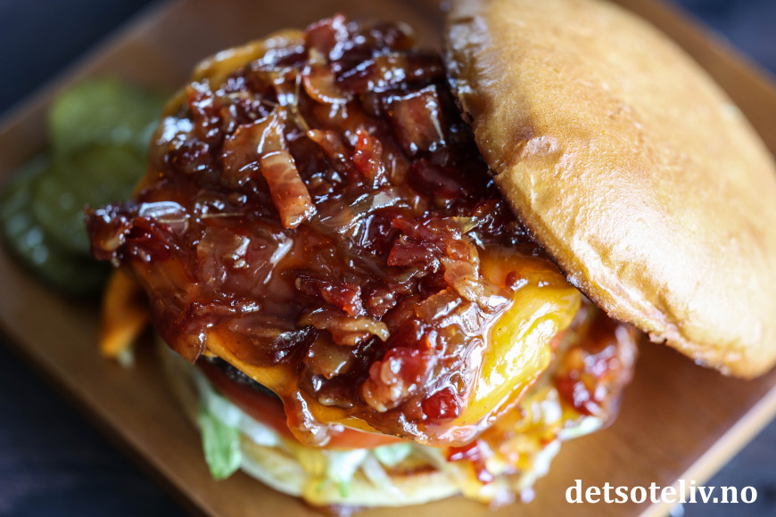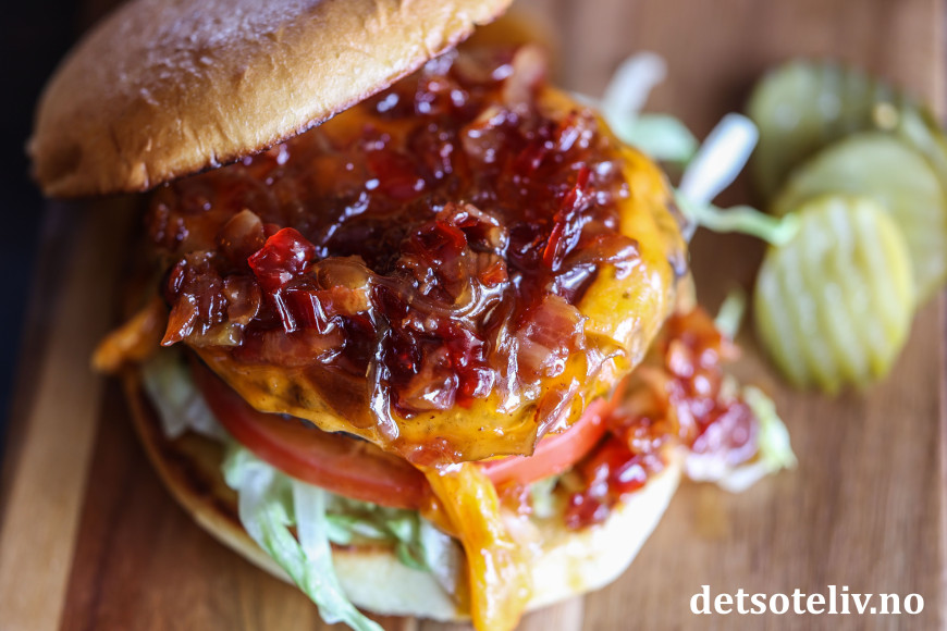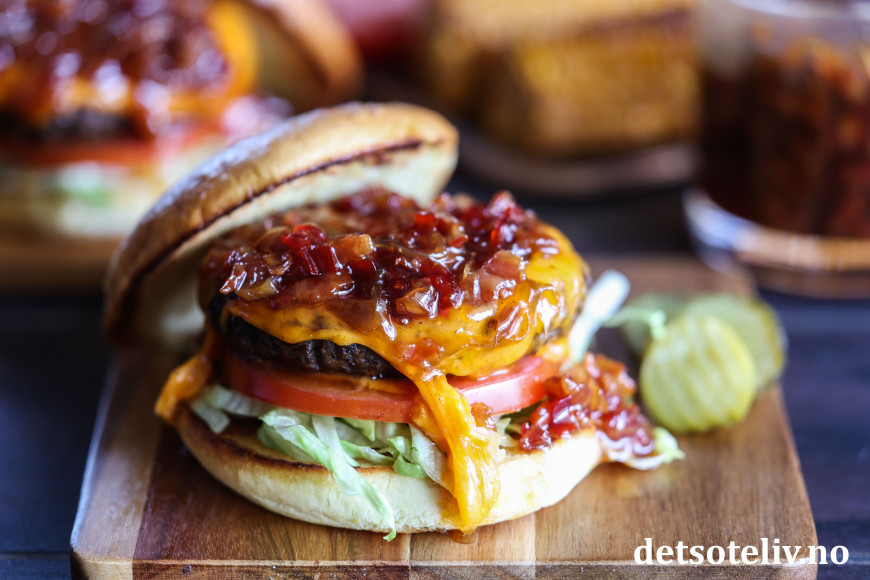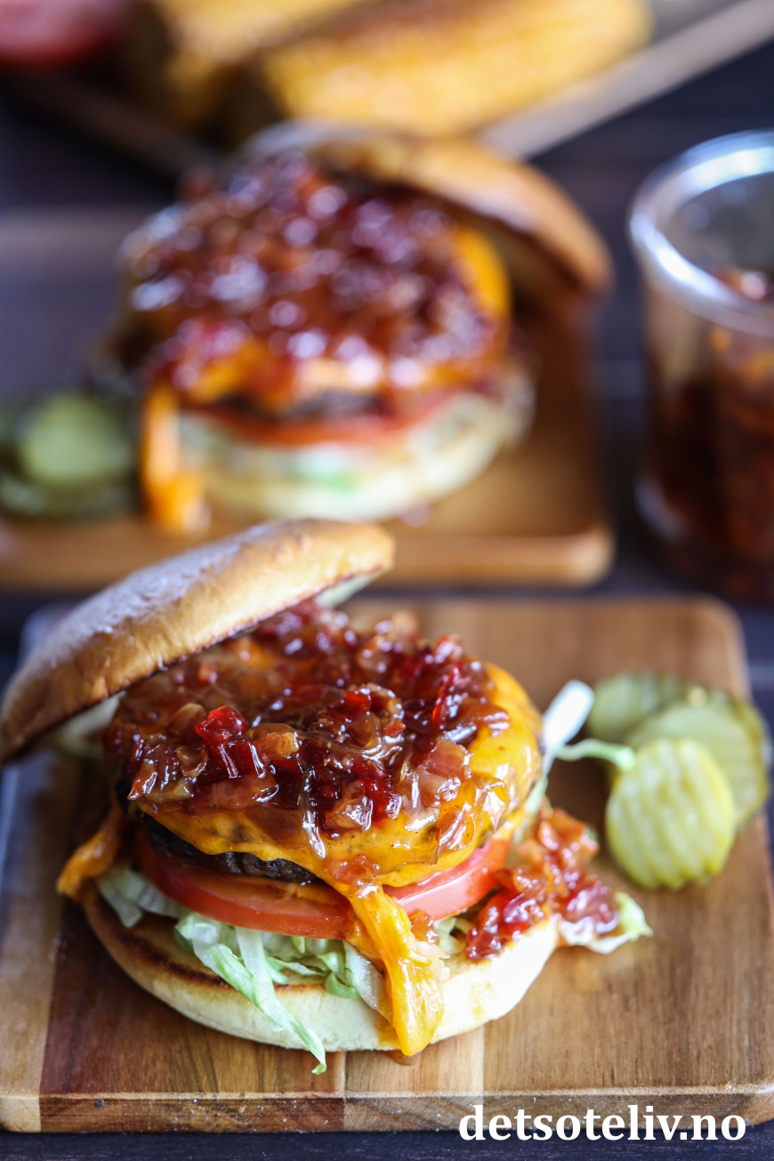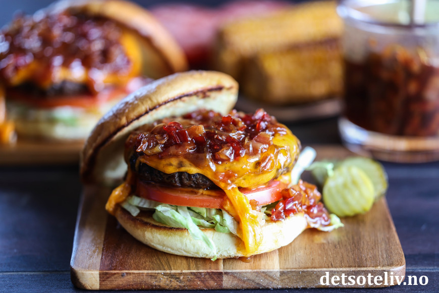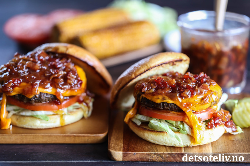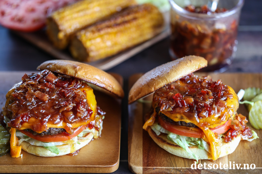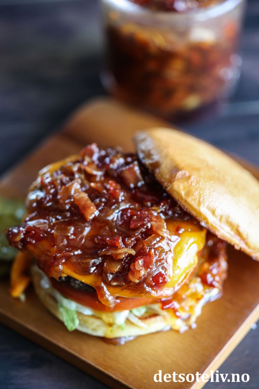 Hjemmelaget søt, salt og småspicy Baconmarmelade er skikkelig digg i en saftig burger!