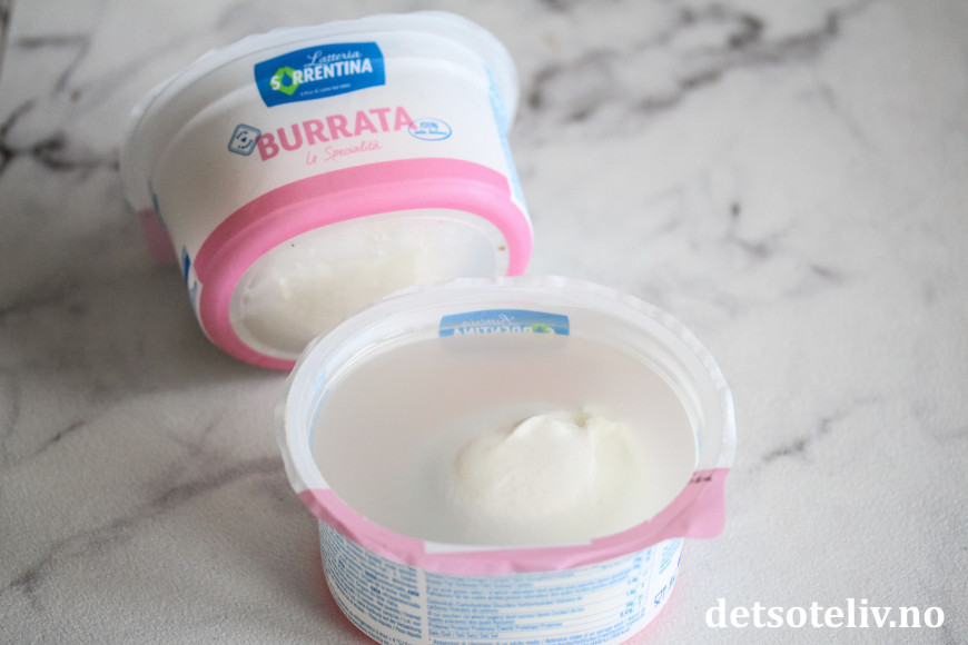 ♥ Burrata fås kjøpt i de fleste, velassorterte norske matbutikkene. De ligger i lettsaltet vann og må derfor få renne litt av seg før du legger osten på tallerkenen.