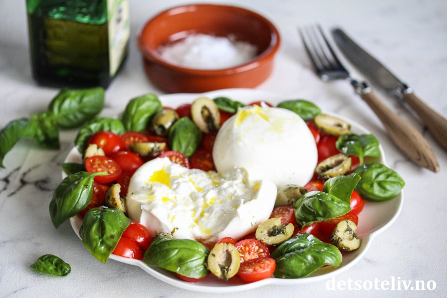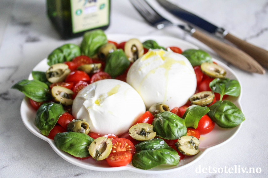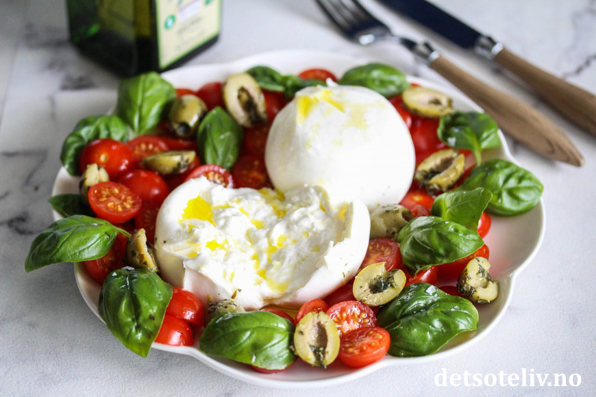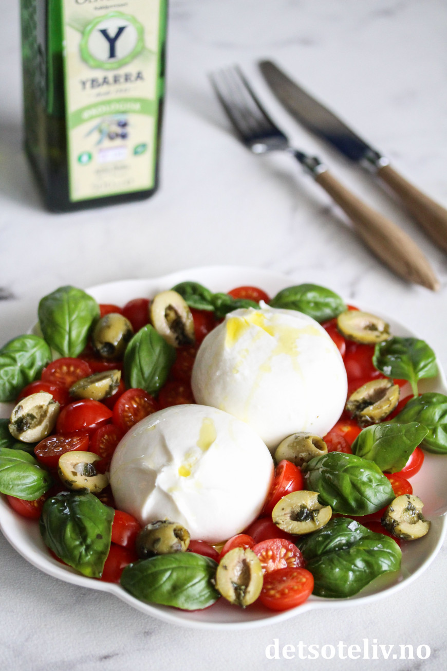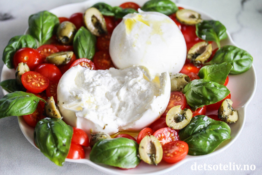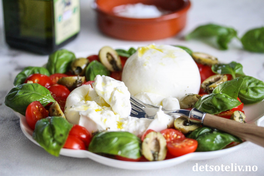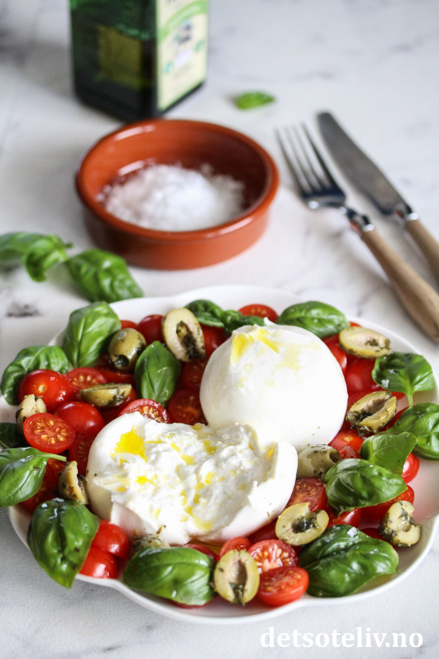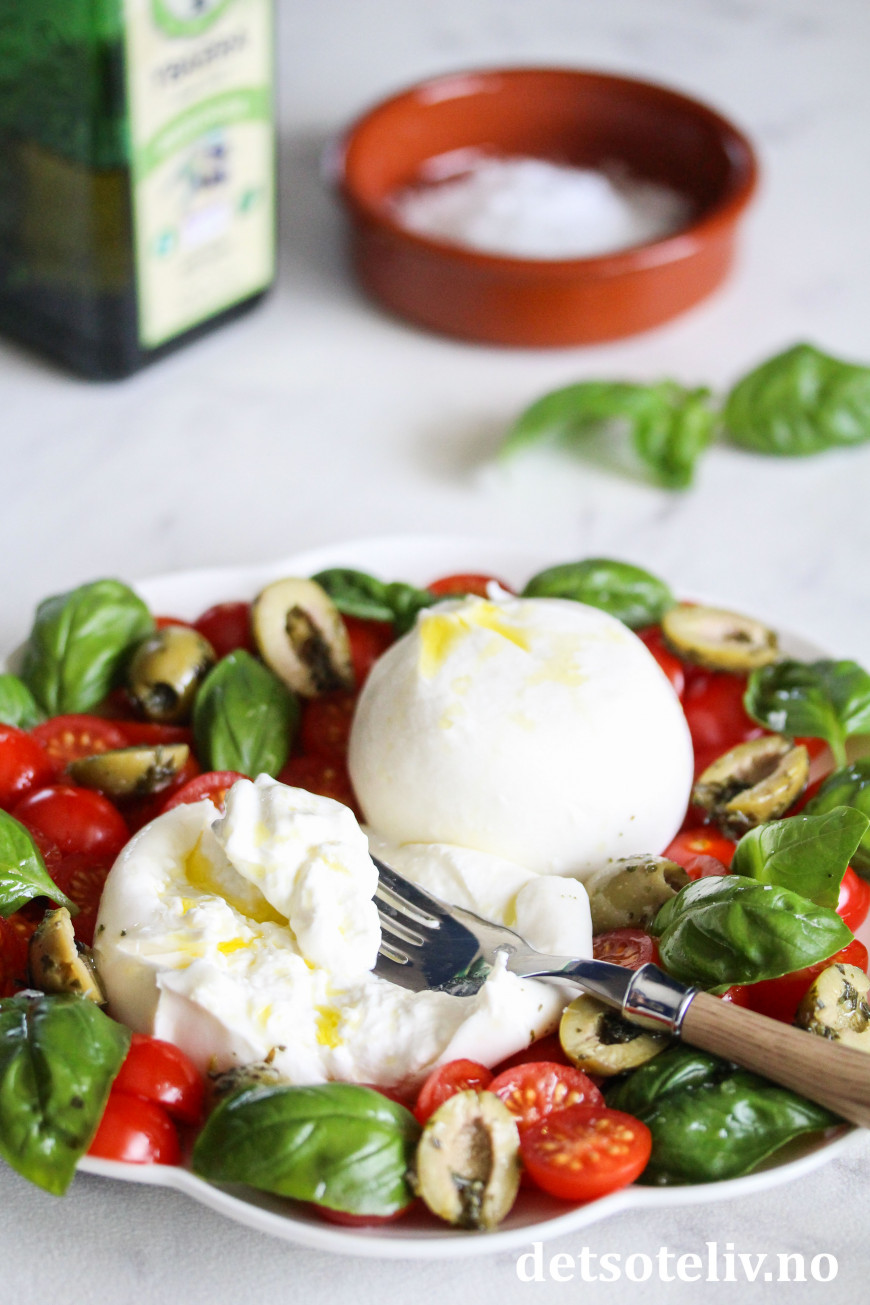 Burrata er så godt at den kan nytes som den er, med bare et lite dryss flaksalt og god olivenolje. Her har jeg i tillegg lagt til noen søte cherrytomater, hvitløksoliven og fersk basilikum. Buonissimo!