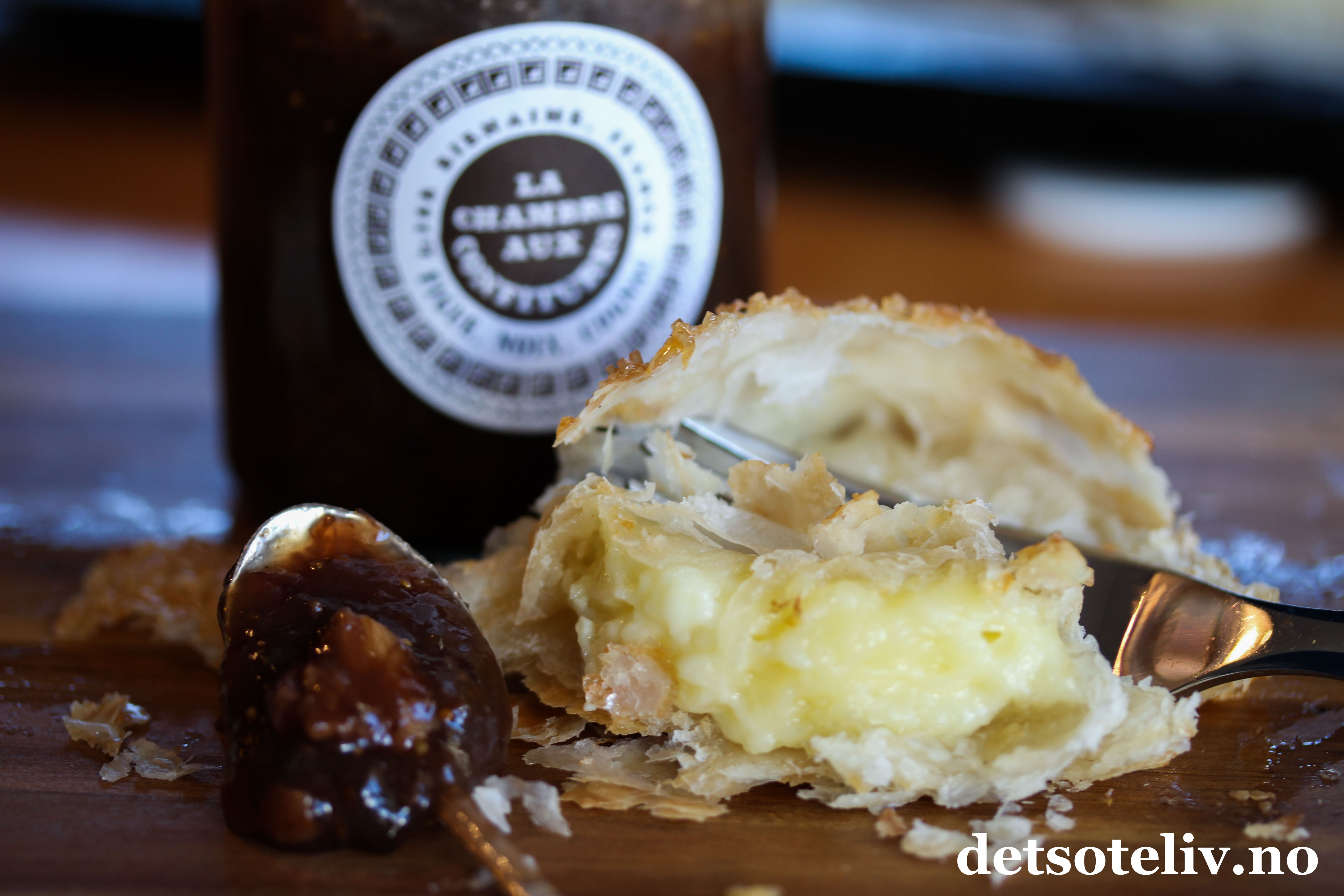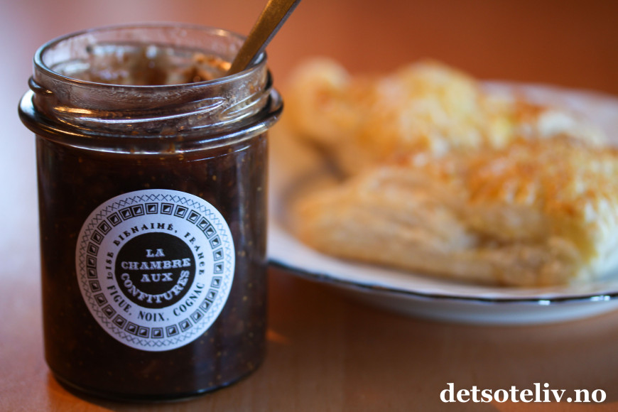 Server med ønsket syltetøy ved siden av. Min favoritt er fikenmarmelade med valnøtter og konjakk, som du enten kan få ferdigkjøpt av merket La Chambre aux Confitures, eller lage selv etter oppskrift på Det søte liv som du finner HER.