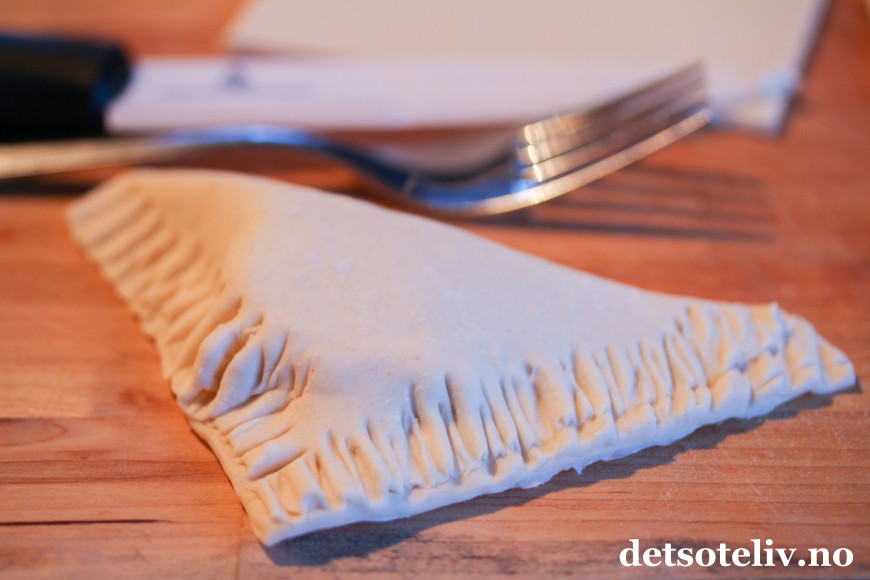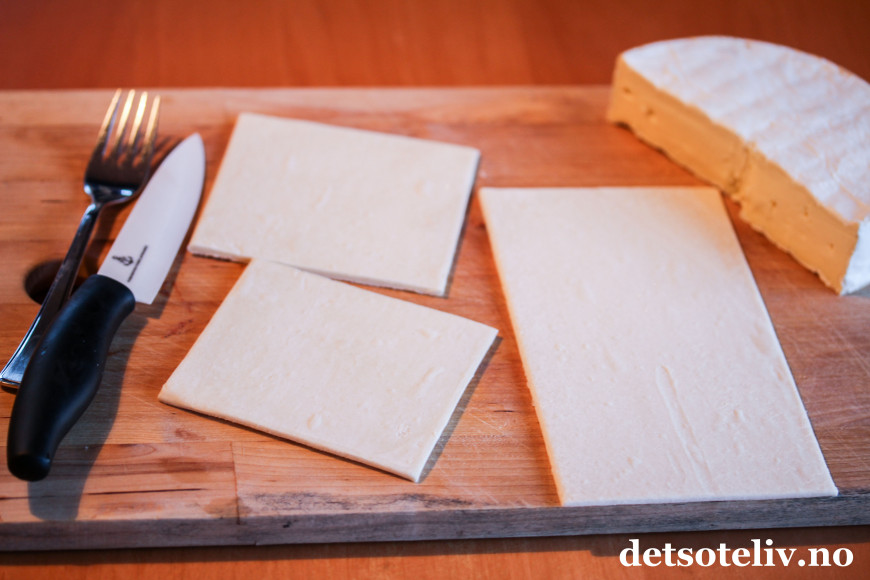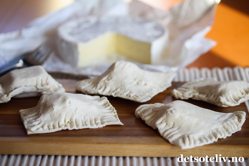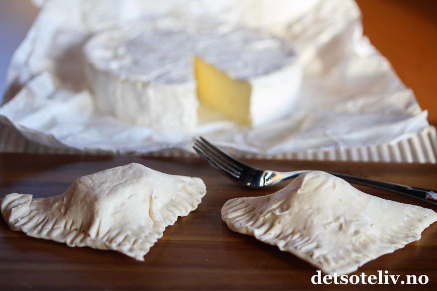 Brett over deigen. Jeg pleier ikke å kjevle ut deigen, men bruker såpass mye ost at jeg må dra litt i deigen for å få den til å dekke hele ostebiten. Klem deigkantene godt sammen med en gaffel.