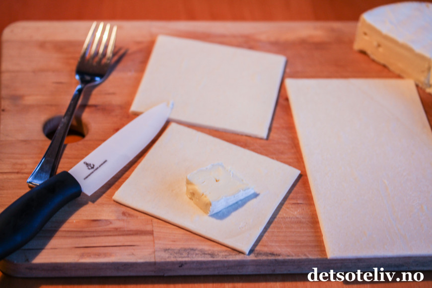 Del hver plate på midten. Legg en passe stor ostebit oppå hver firkant og brett over deigen. Jeg pleier ikke å kjevle ut deigen, men bruker såpass mye ost at jeg må dra litt i deigen for å få den til å dekke hele ostebiten. Klem deigkantene godt sammen med en gaffel. Det er viktig at det blir helt tett, ellers vil den smeltede osten renne ut av butterdeigskakene i ovnen.