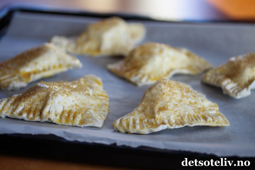 Legg butterdeigskakene på et stekebrett dekket med bakepapir. Pensle over med sammenvispet egg og dryss over godt med brunt sukker.