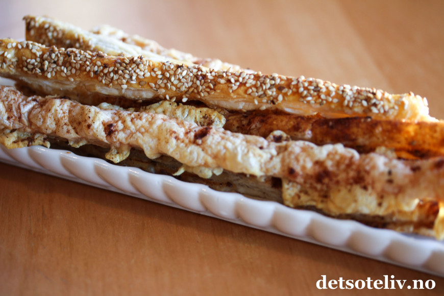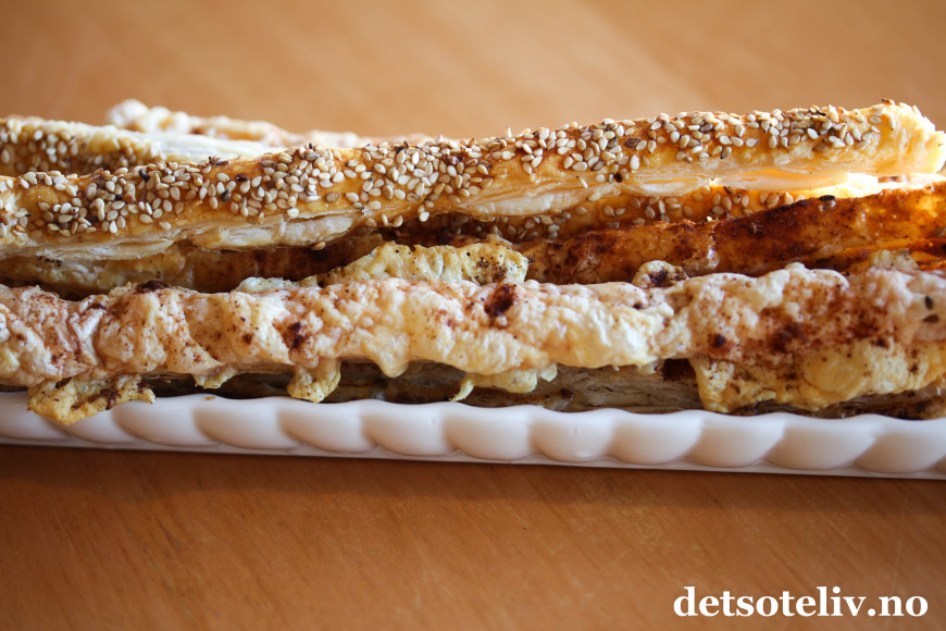 Kjevle ut butterdeigsplatene forsiktig ut på bakepapir til de blir ca. dobbelt så lange. Skjær platene i striper som er ca. 1 cm brede. Legg dem på bakepapirdekkede stekeplater med litt avstand mellom. Pensle over med sammenpisket egg og dryss over det du liker best. Jeg drysset noen med sesamfrø, noen med paprikapulver og noen med revet gulost.