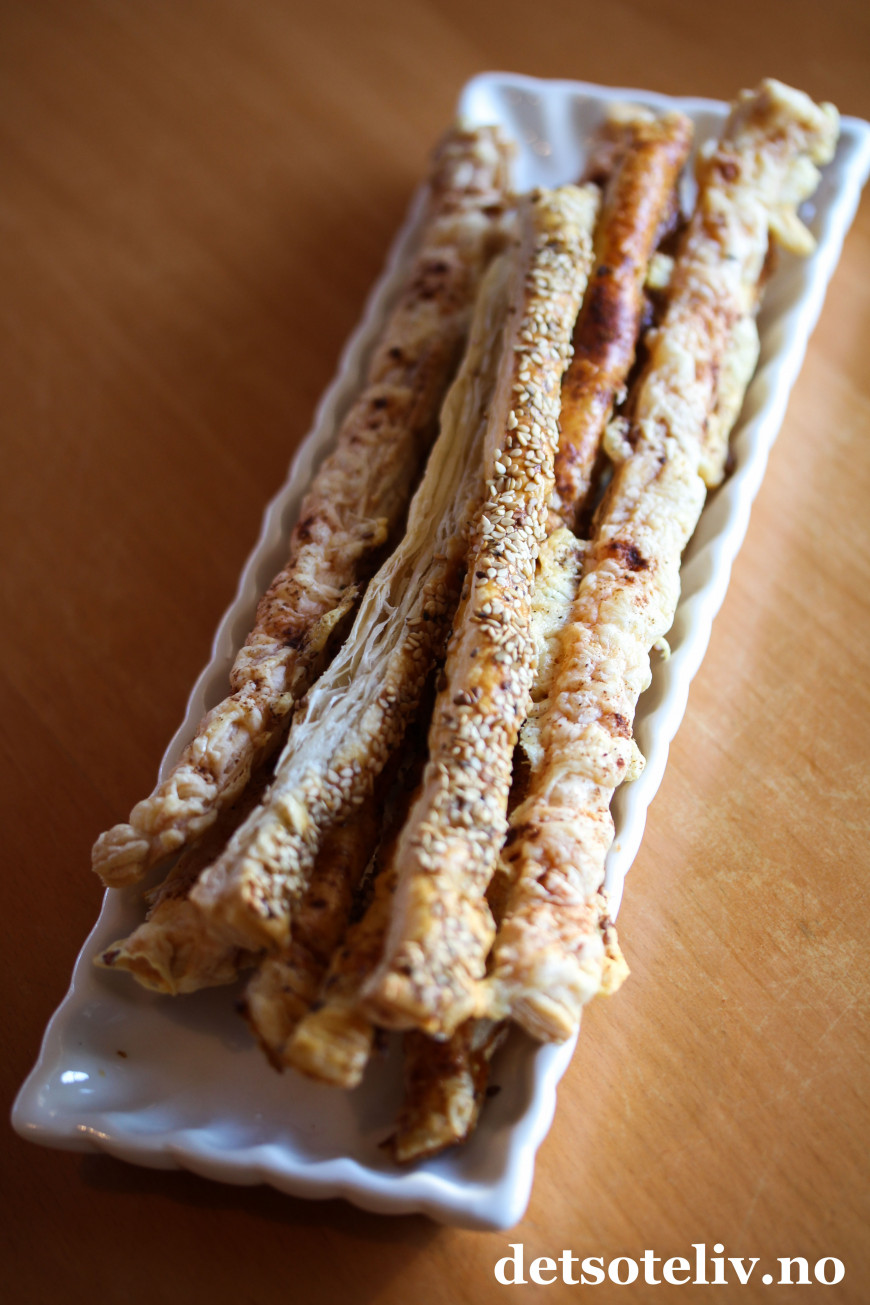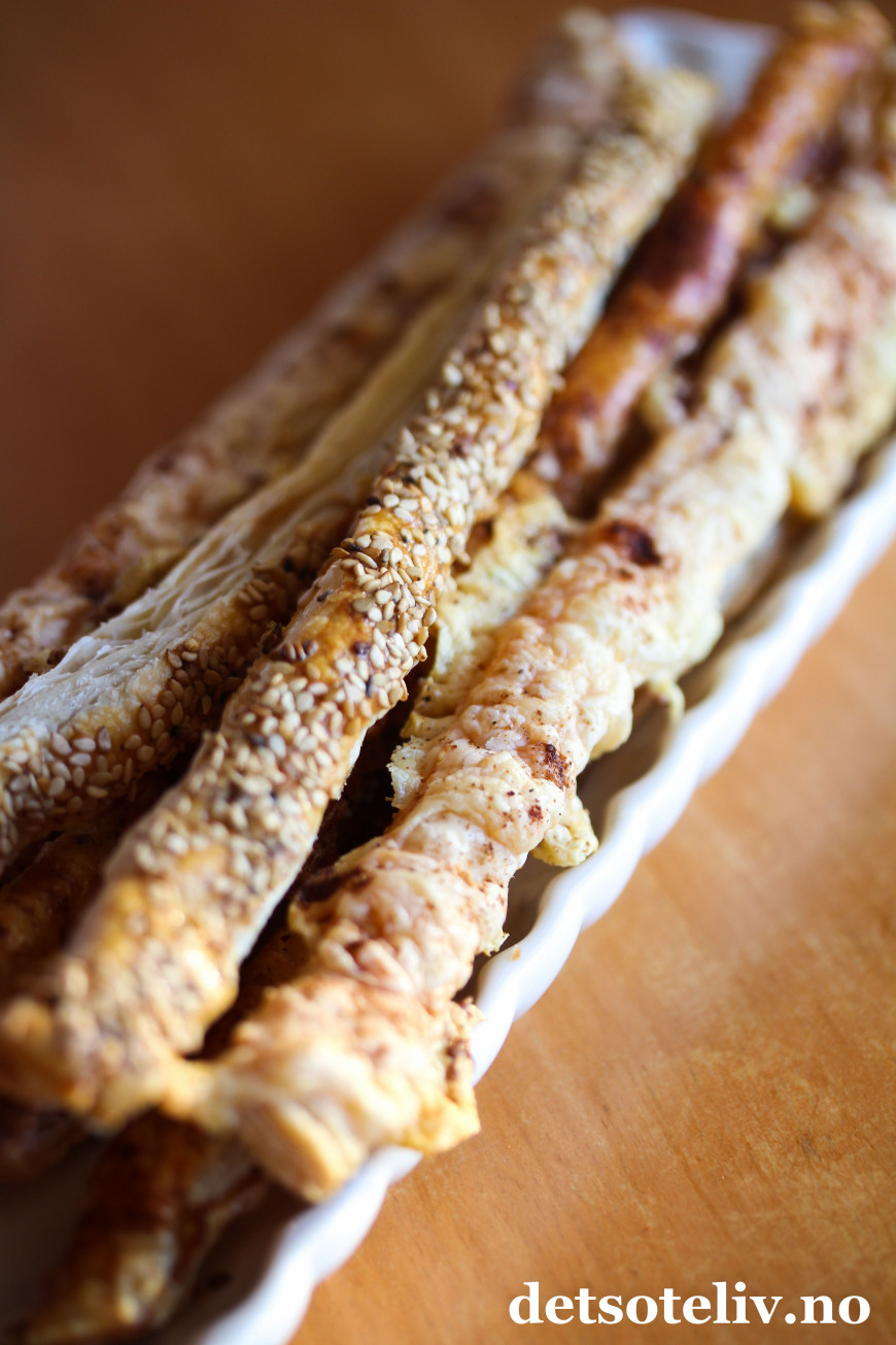 De er veldig enkle å lage dersom du bruker ferdigkjøpt butterdeig som jeg har gjort her. Du kan variere butterdeigstengene ved å drysse dem med sesamfrø, paprikapulver, revet ost, urter osv.