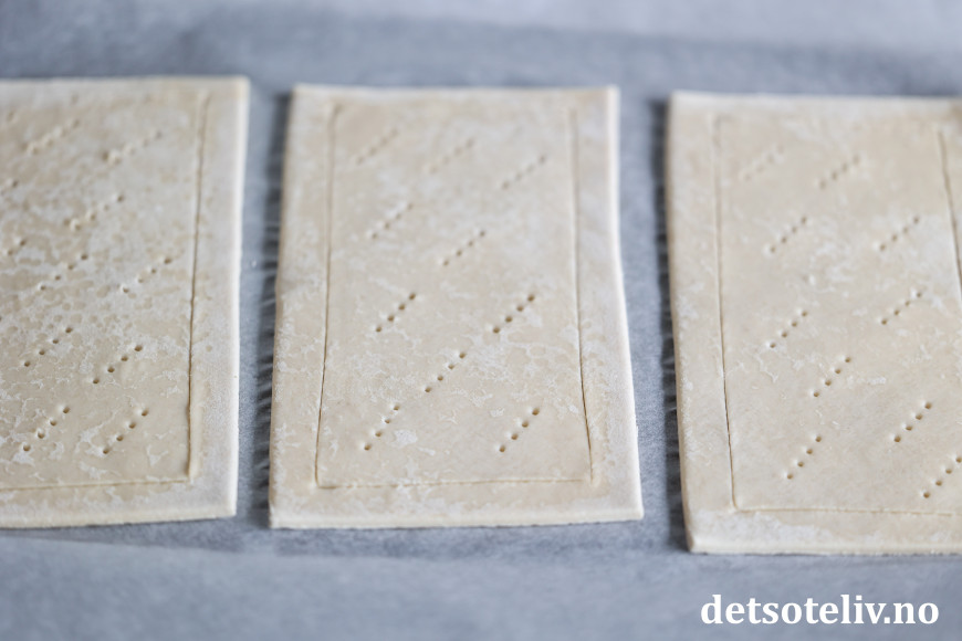 Bruk en liten, skarp kniv til risse en tynn kant på innsiden av hver firkant. Det er ikke meningen at man skal skjære helt igjennom deigen, kun lage et snitt som markerer kanten ca. 1 cm innenfor ytterkanten. Prikk butterdeigsplatene med en gaffel.