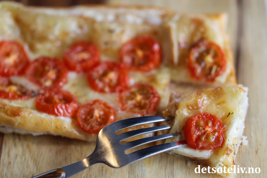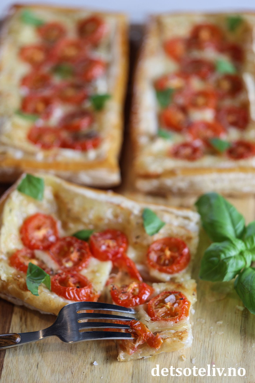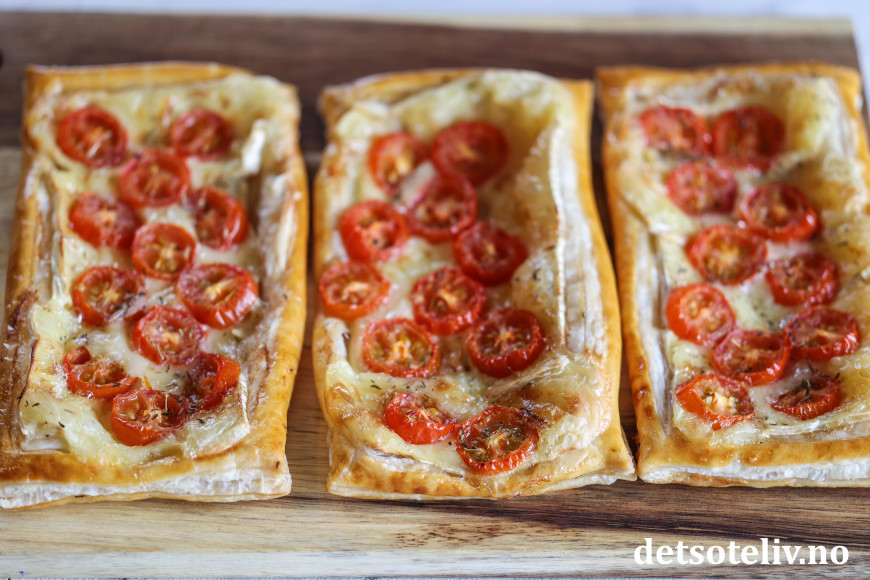 Her har jeg laget noen kjempegode terter som jeg har dekket med Brie, søte småtomater, krydderurter og litt flaksalt. Det tar bare noen minutter å sette dem sammen. Tertene nytes nystekte, mens butterdeigen er varm og knasende sprø og osten smeltet. 😍