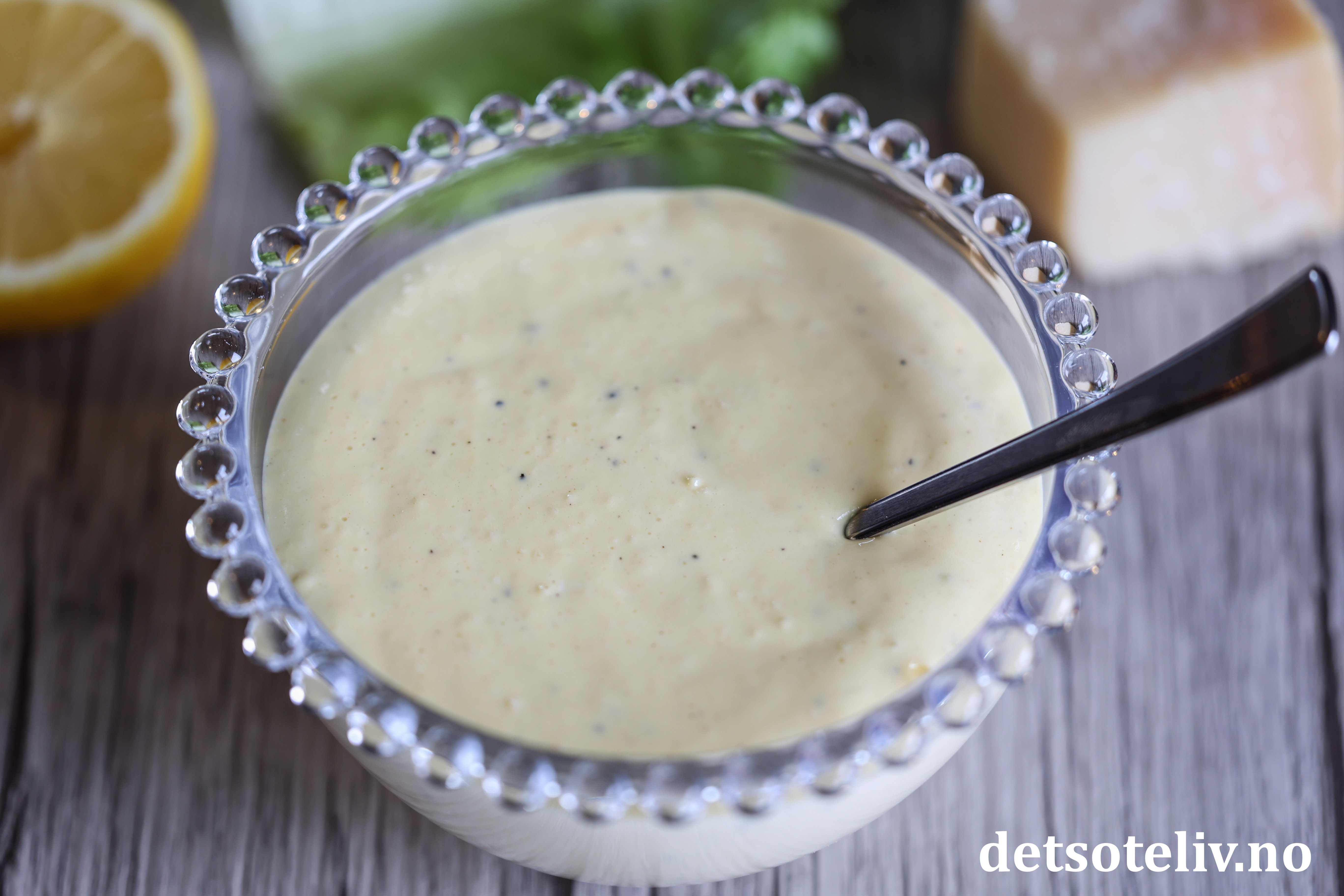 Ha majonesen over i en skål. Tilsett finrevet parmesan. Smak til med eventuelt litt mer salt, pepper og sitronsaft. Juster tykkelsen på dressingen med litt varmt vann dersom du synes den er for tykk.