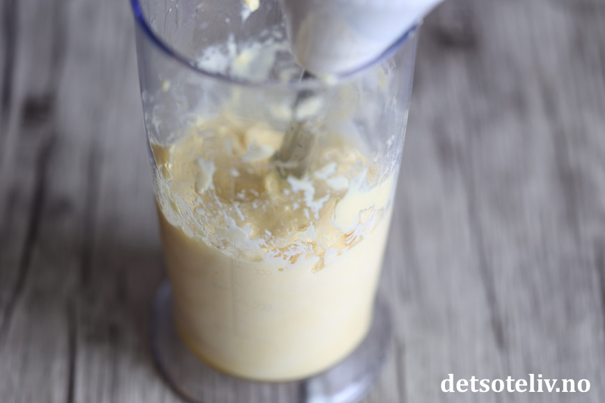 Hell så i litt og litt av oljen mens du kjører i vei med stavmikseren hele tiden. Ta noen pauser med oljen, og la stavmikseren kjøre litt ekstra mellom hver gang du heller i oljen. Det er viktig at oljen innarbeides gradvis inn på denne måten, ellers kan blandingen skille seg. Etter hvert vil du se at det danner seg en tykk, lysegul majones.